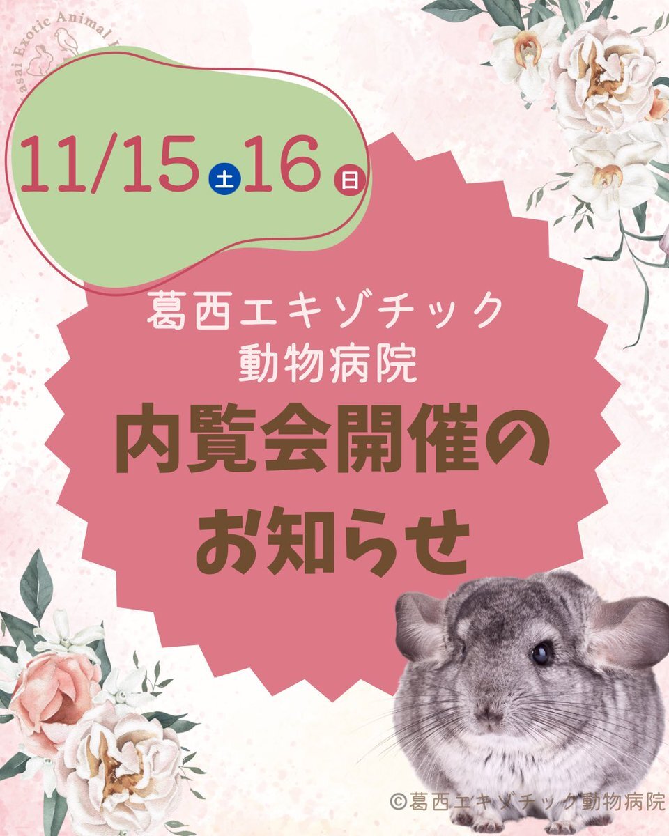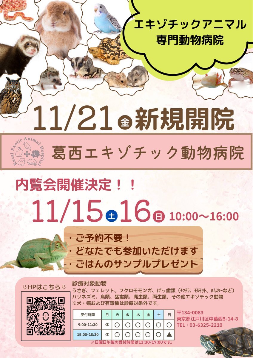 内覧会は11月15日(土)16日(日)です🙋♀️ ご予約など不要です! 見ていただけない手術室や入院室なども、ご覧いただけます。 ぜひお気軽にいらっしゃってください☺️ #動物病院 #新規開院 #エキゾチックアニマル #内覧会 x.com/kasai_exotic_a…