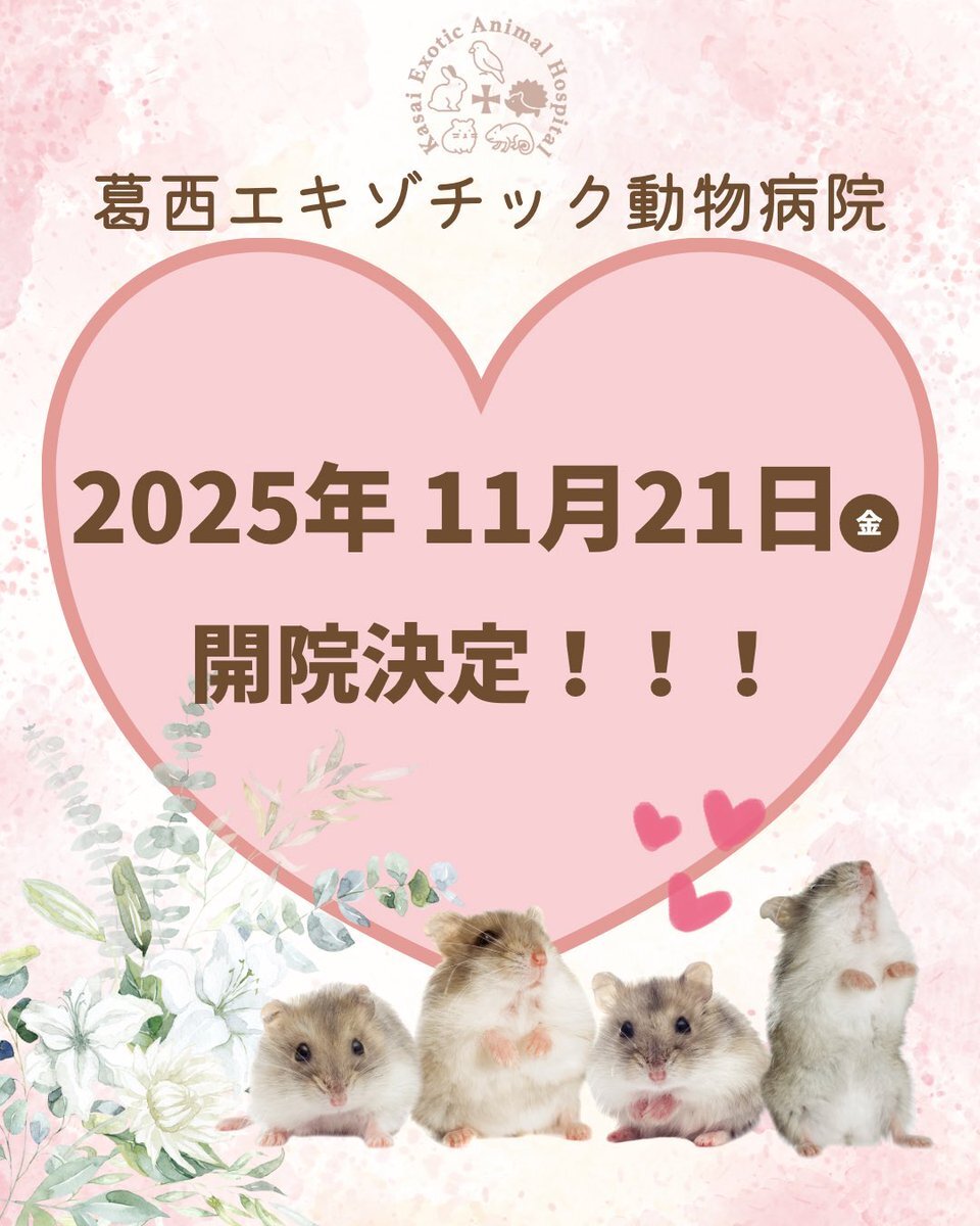 【開院日決定のお知らせ】 開院が、2025年11月21日金曜日に決定致しました!!🎉🎊 内覧会なども実施予定です🫡 また詳細は後日お知らせします。 オンラインでのご予約は11月1日から開始予定です! #動物病院 #新規開院 #内覧会 #開院日 #お知らせ #エキゾチックアニマル pic.x.com/Alk5EntR9f