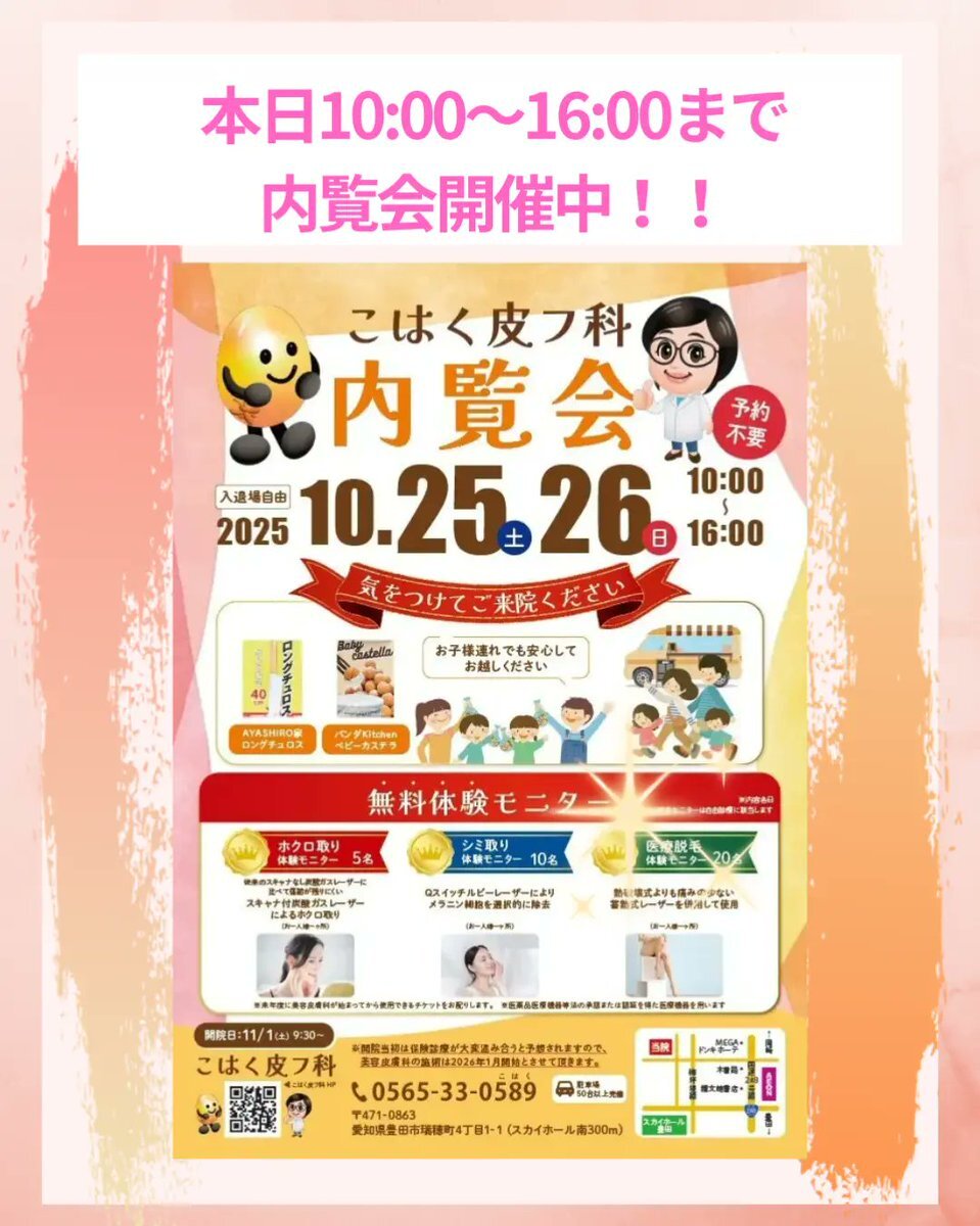 【本日内覧会を開催いたします‼️】 🕙時間は10:00~16:00、予約不要・入退場自由 お子様にはお菓子のプレゼント🎁 ご家族の方にはロングチュロスorベビーカステラの引換券をお渡しします✨ ハズレなしのくじ引きも開催! ぜひ、お気軽にお越しください😊 #皮膚科 #小児皮膚科 #内覧会 pic.x.com/KzSQpJUkLW
