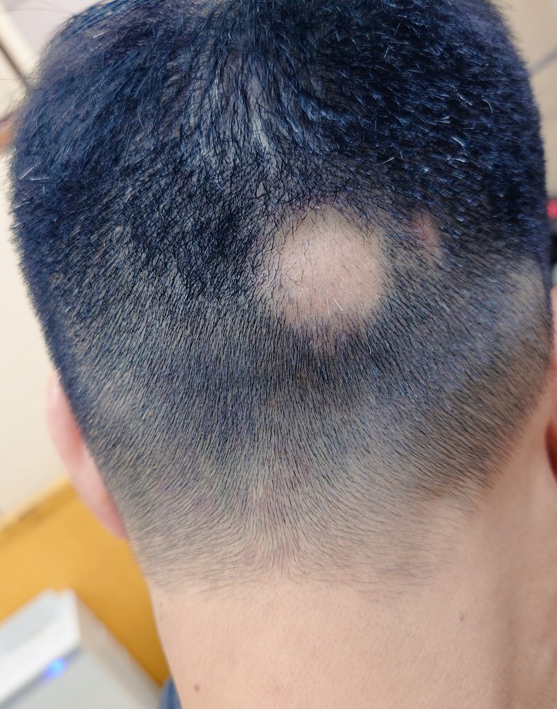 円形脱毛。10年以上ずっと500円穴に最近、白い毛が生えて来るように感じる。改善傾向なら良いのだろうが、多発で頭は穴が20個以上はあるが、加齢もあるから、実際は頭剃ってるが、たまに穴の様子で数日伸ばしていて観察している。 #円形脱毛症 #多発 腕とすねの毛も抜けて戻ってはこない。 pic.x.com/Qsqad9DU7n