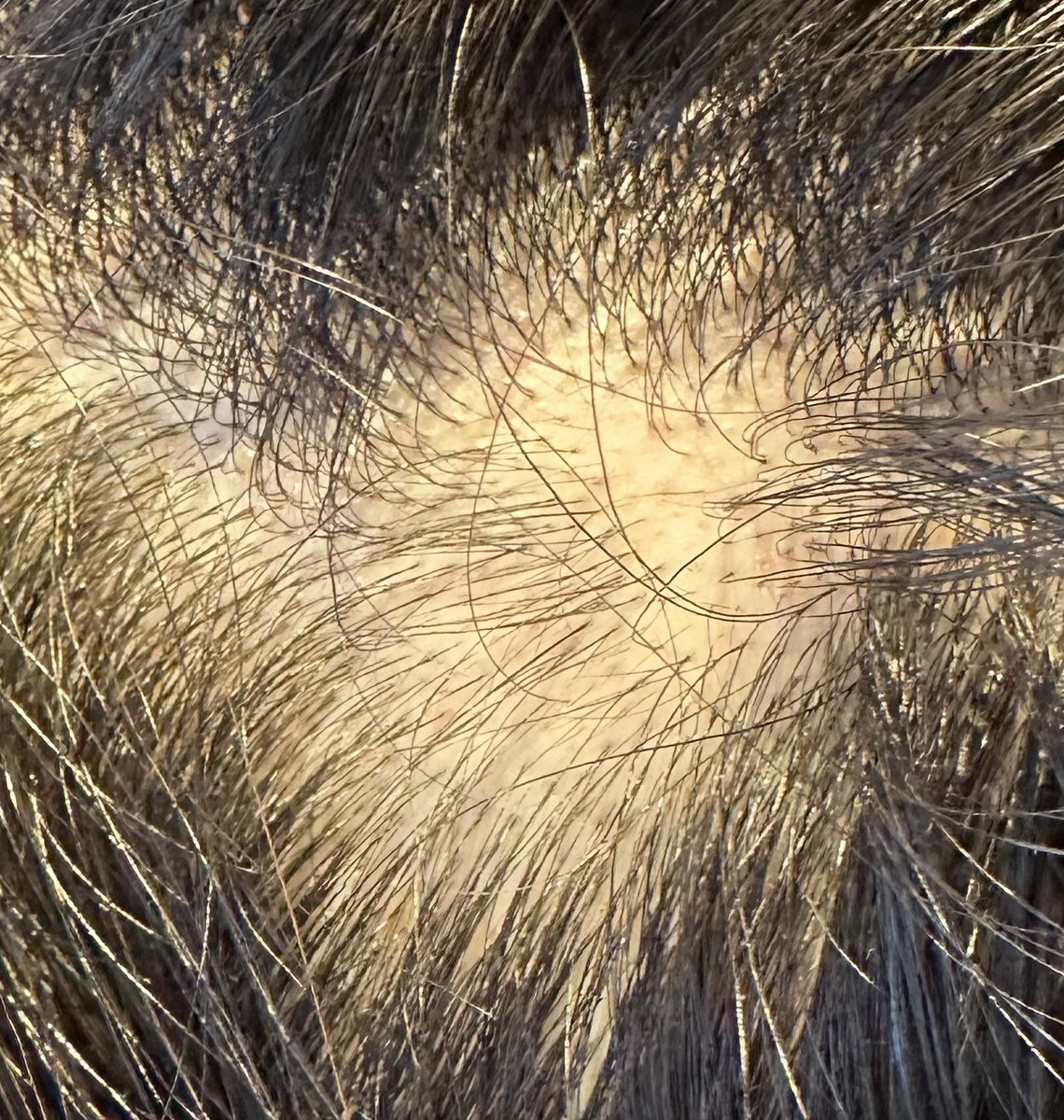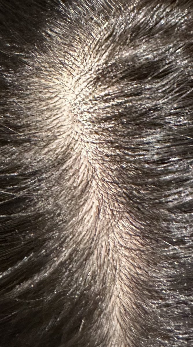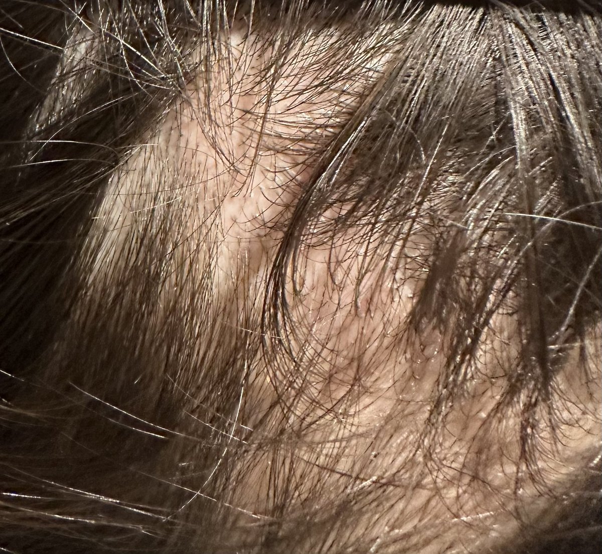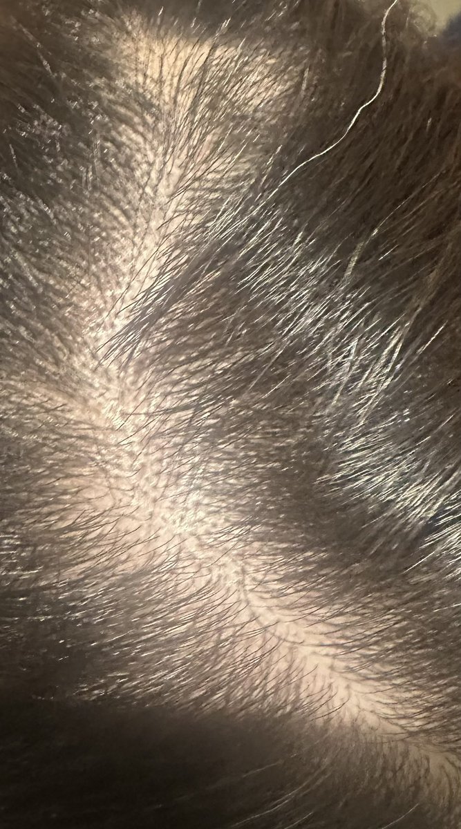 254日目。 おでこ付近の写真撮ってた時、薄いとこ見つけて、(多分前もこんなの撮った気がする)結構な薄さに久々衝撃🫨 ちゃんと色々観察しないとな😇 アホ毛ぴょんぴょんも早く治ってほしい😂 元気過ぎるw #円形脱毛症 #ハゲ pic.x.com/HAj1vFgVCu