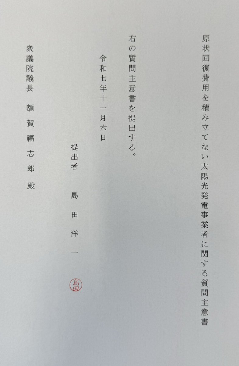 本日、「原状回復費用を積み立てない太陽光発電事業者に関する質問主意書」を提出。 平井宏治氏の協力を得ました。 日本のエネルギー基盤を立て直す一環として、太陽光・風力利権には引き続き切り込みます。