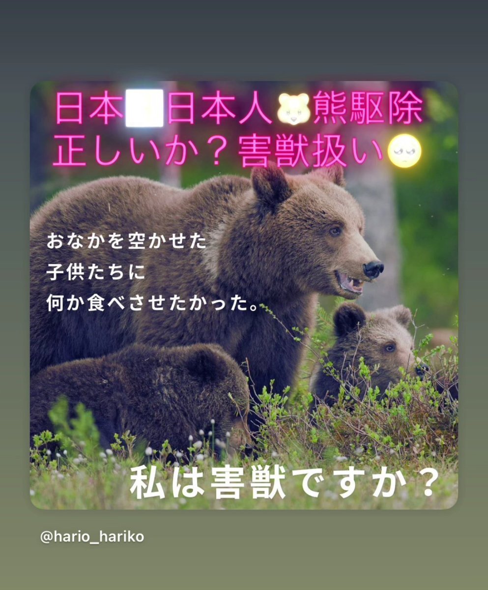 🐻熊が悪いのか、ニュース報道ではなく自分の頭で1回だけ、考えてみて欲しいです 開拓で山は削られ、さらに高度経済成長期に人工林にされたことで、熊たちは住む場所も食べ物も足りていません 殺してもキリがない、 これからは自然の山を返すことが、必要です🌳 IG alice.pi.john.tom 様より
