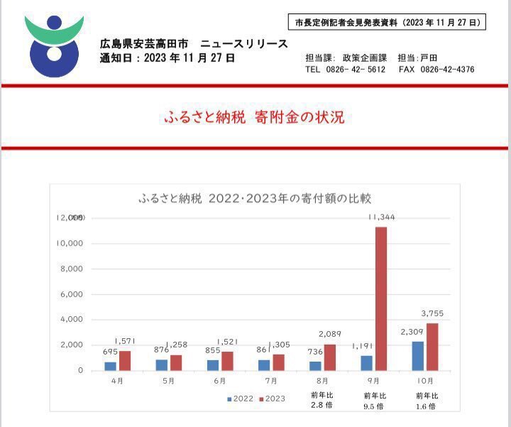 広島県安芸高田市(石丸前市長(石丸伸二))の、ふるさと納税の現実。 10倍って・・・2023年9月が9.5倍になっただけなんだけど・・・(添付画像1枚目参照) ちなみに、制度改正前の追い込みで、全国の自治体で9月は跳ね上がっている(添付画像2、3枚目、および下記ポスト参照) x.com/ajzmck/status/…
