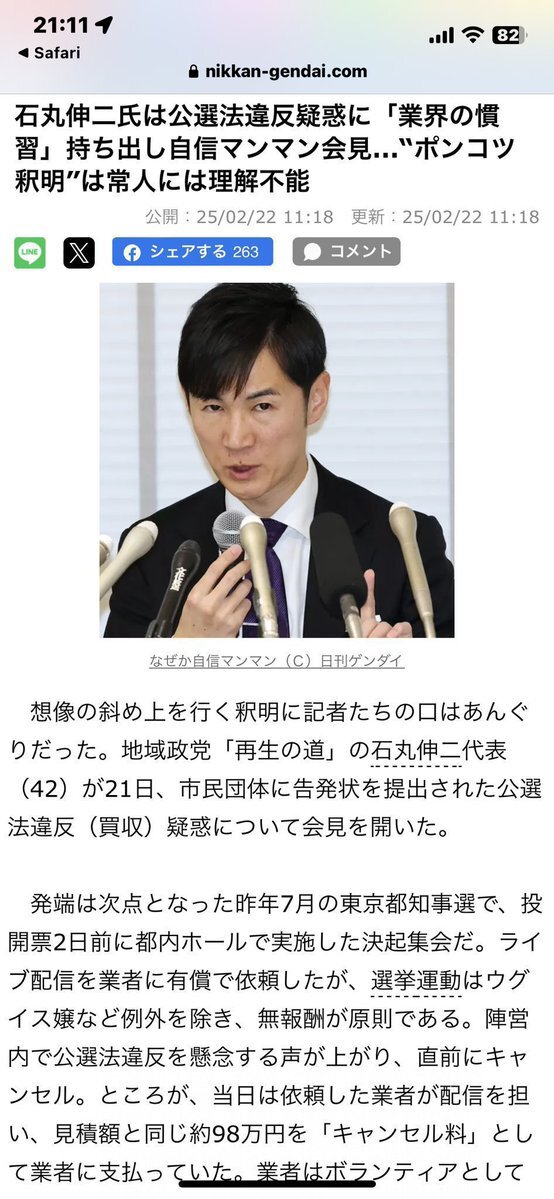 街頭演説では、「業界の慣習」を無視して、勝手な振る舞いをしていた石丸伸二(地域政党「再生の道」前代表(無職))だが、公職選挙法違反が疑われたら、「業界の慣習」を連発していた。 #石丸伸二 #石丸新党 #地域政党 #再生の道 #東京都議会 #東京都議会議員選挙 #東京都知事選挙 #参議院議員選挙 pic.x.com/b80hQfQEl9 x.com/n1e9fdbuhxqzzj…