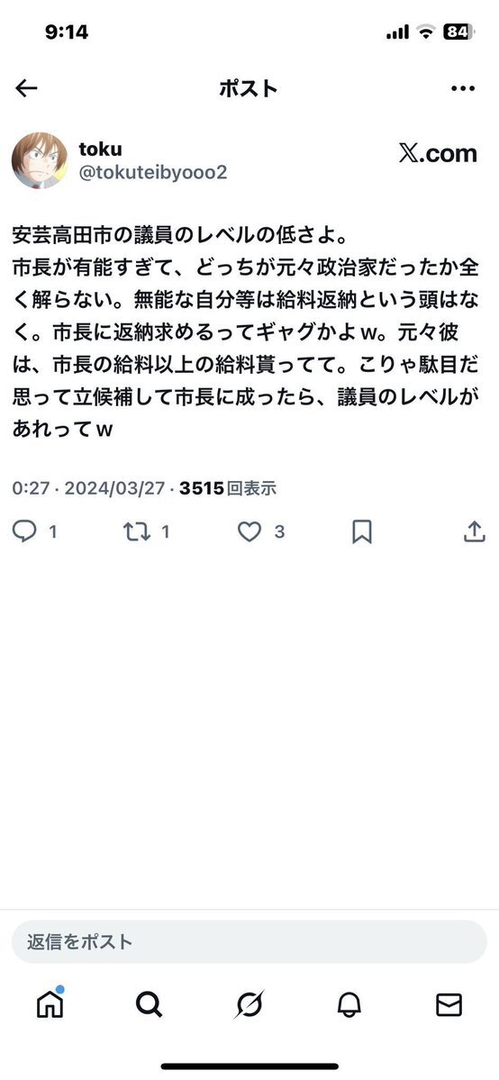 #石丸伸二 #再生の道 こないだから長々書いてる石丸信者の人だが。 私の認識では 根拠をだしたまともな反論をしないので もう終了したと宣告し 返信するなといいおいて 話を切った。 返信ももう途切れがちだったし もうそれでいいだろう。 pic.x.com/c69urZ9shc