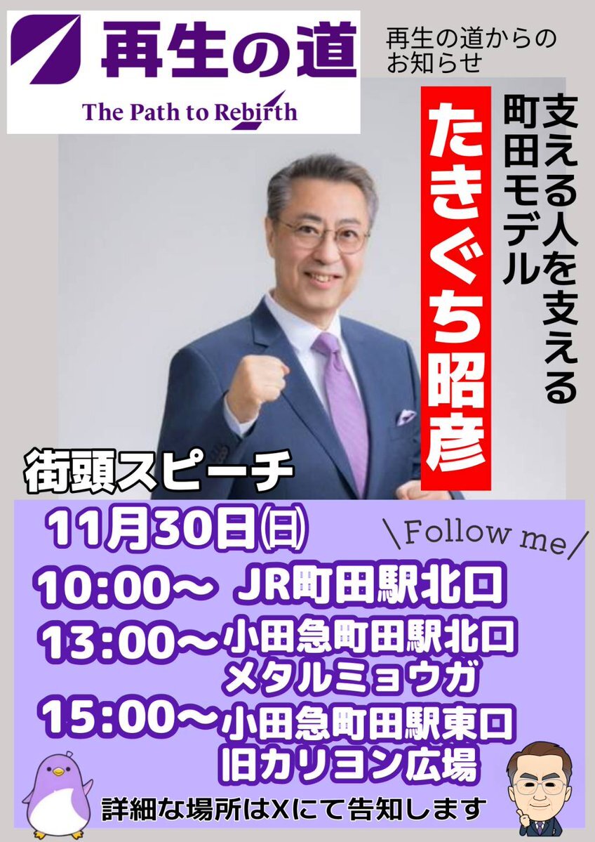 町田市の"たきぐち昭彦さん" 明日30日 日曜日は、  JRと小田急 町田駅周辺でご挨拶。 教育や福祉など「支える人を支える」社会へ! 町田モデルをつくります📣 #たきぐち昭彦 #再生の道 x.com/takiguchi55/st…