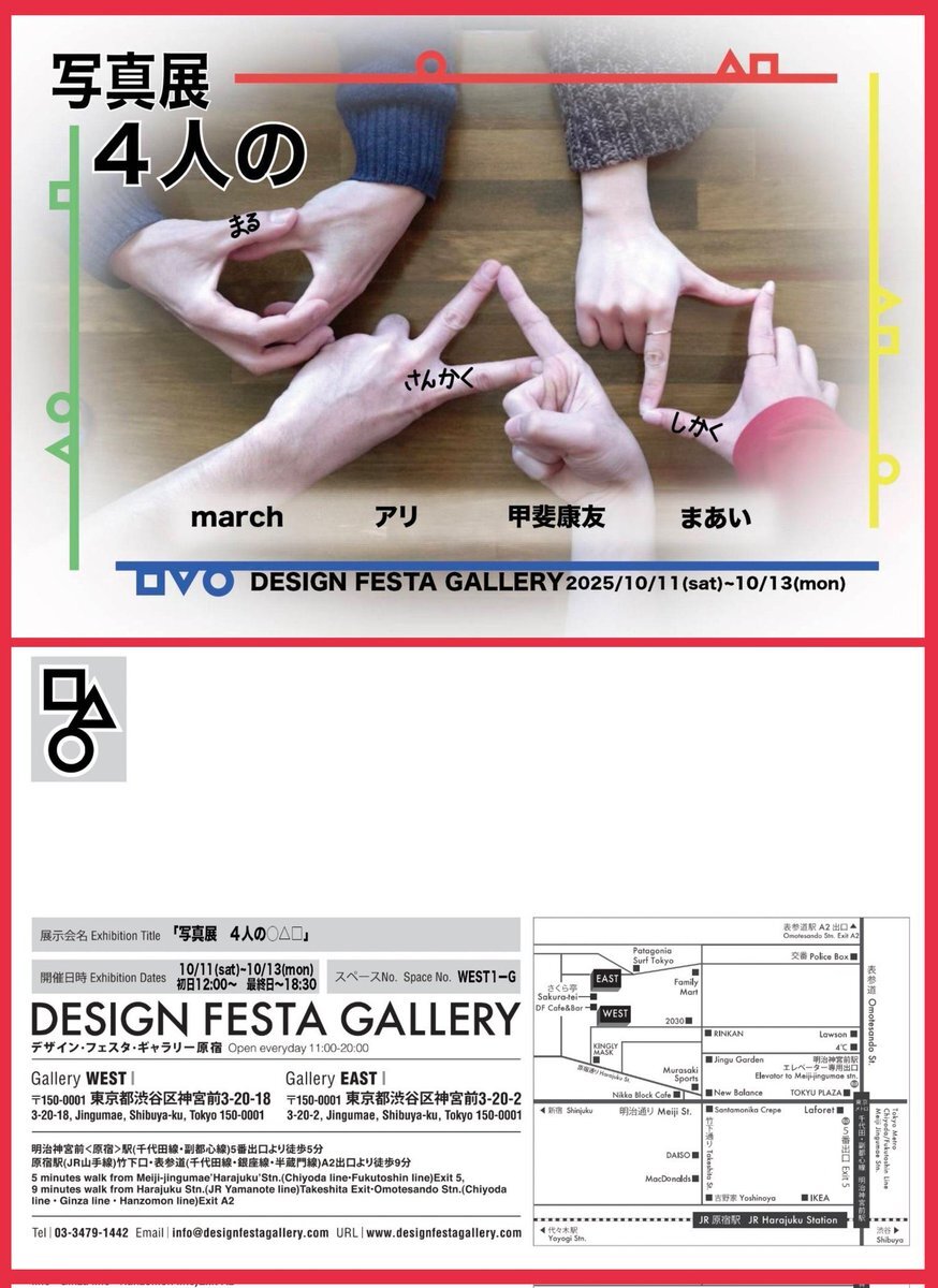 グループ展やります!! 【写真展 4人の◯△□】 会期 10/11(土)〜10/13(月・祝) 場所 デザインフェスタギャラリー原宿( @DFGHarajuku ) アリ @alibi5753 甲斐友康 まあい instagram.com/maai_idobataka… march @march80667835