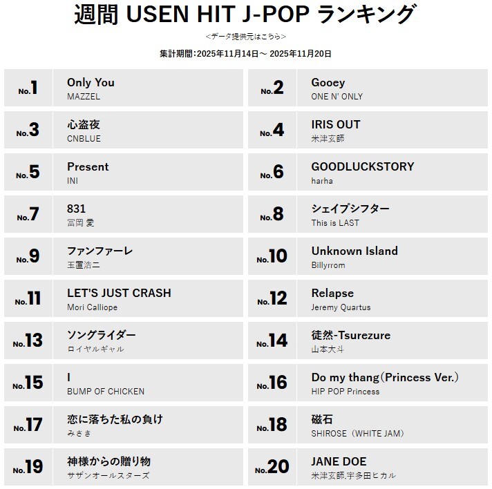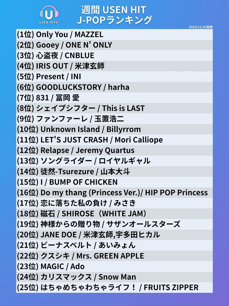 今週のUSEN HIT J-POP ランキング 発表!🔔 オンエアは11/29からスタート🔊