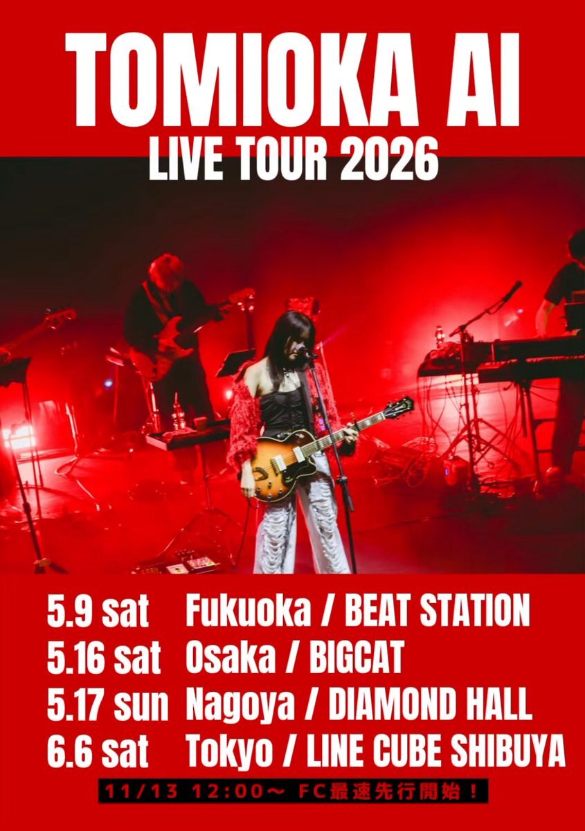 【🔔】 TOMIOKA AI LIVE TOUR 2026 開催決定!! 全国4都市を巡ります👁️✨ ツアーファイナルはLINE CUBE SHIBUYA🔥 明日12:00〜FC先行受付開始! ぜひあいにきてね👁️ FC先行受付期間:2025年11月13日(木)12:00〜11月27日(木)23:59 🎫ticket fanicon.net/ticket/6969