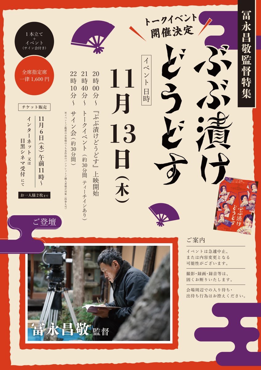 【🪭本日開催🪭】 𐃬𐃬𐃬𐃬𐃬𐃬𐃬𐃬𐃬𐃬𐃬𐃬𐃬𐃬𐃬𐃬 『#ぶぶ漬けどうどす』#冨永昌敬 監督 トークイベント付き上映&サイン会 𐃬𐃬𐃬𐃬𐃬𐃬𐃬𐃬𐃬𐃬𐃬𐃬𐃬𐃬𐃬𐃬 🗓️11/13㊍ ☆20:00〜『#ぶぶ漬けどうどす』 ☆21:40〜 トークイベント ☆22:10〜 サイン会 🎟️ご予約⇒x.gd/tApbn