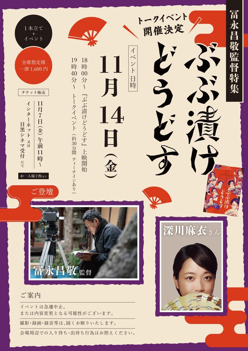 / 本日 🪭舞台挨拶🪭 残席あとわずかです! \ 『#ぶぶ漬けどうどす』 📍#目黒シネマ 🗓️本日11/14(金) 18:00の回 上映後トークショー 登壇:#冨永昌敬 監督 / #深川麻衣 さん 🎟️ご予約はこちら⇒x.gd/8ZLx1 x.com/megurocinema/s…