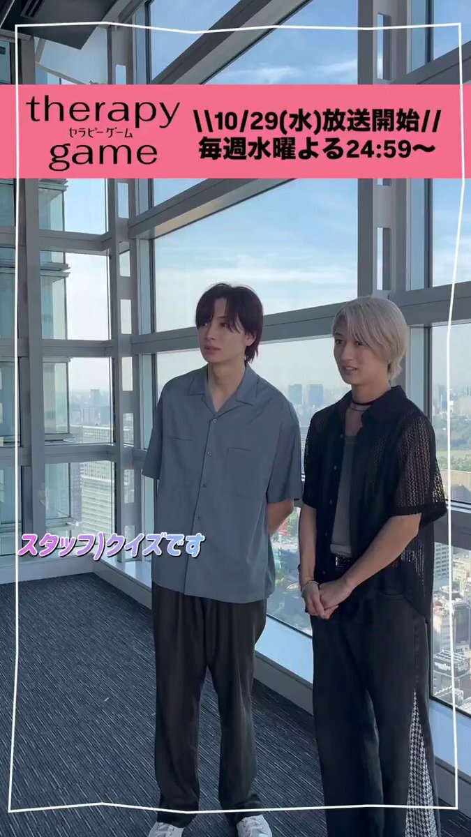 ◤ 💛❤️📷#ドラマセラピーゲーム📷💛❤️ 主演のお二人にいきなりクイズを仕掛けてみました!◢ 📺放送日程📺 10月29日(水)24:59 日本テレビにて放送スタート 主演 #NAOYA(#MAZZEL) #冨田侑暉(#龍宮城) 公式HP ntv.co.jp/therapygame/ #ドラマセラピーゲーム #NAOYA(#MAZZEL) #冨田侑暉(#龍宮城)
