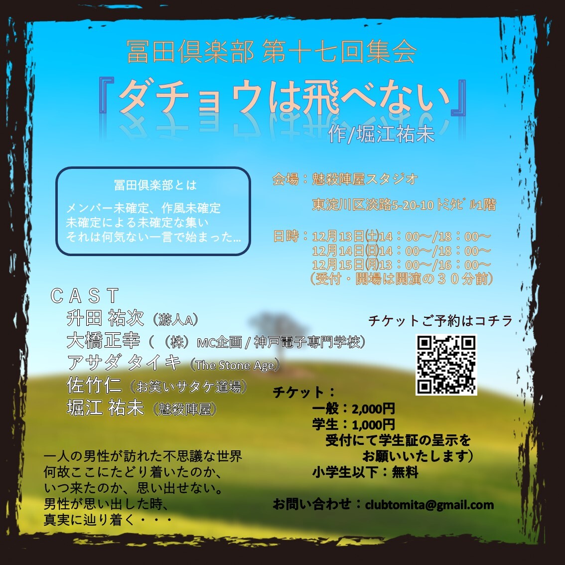 冨田倶楽部第十七回集会 『ダチョウは飛べない』 魅殺陣屋スタジオ 12月13日㈯14:00〜/18:00〜 14日㈰14:00〜/18:00〜 15日㈪13:00〜/16:00〜 受付・開場は開演の30分前です。 チケット 一般2,000円 学生1,000円(要学生証) 小学生以下無料 ご予約 forms.gle/Ua5ipLNGBVvPfy…