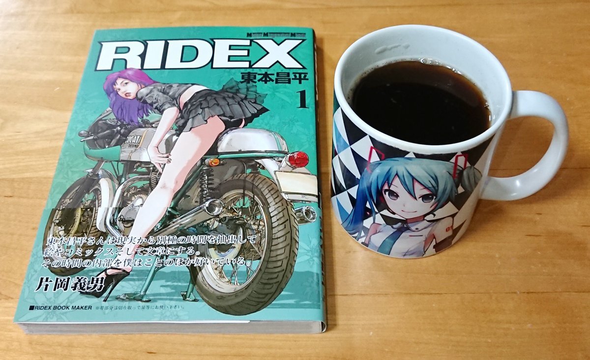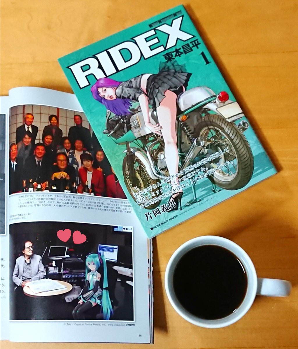 coffee☕time💓 天気予報の外れた夜は ボカマグにコーヒーを淹れて 漫画を読む 東本昌平先生が描いた ミクグリーンのフレームの DUCATI 750SS 大好きな小説家 片岡義男先生の帯コメ コラムに ミクさん大好き冨田勲先生が ハレハレFLHに乗ってたという 衝撃の事実 好きなモノは繋がっているさ💓
