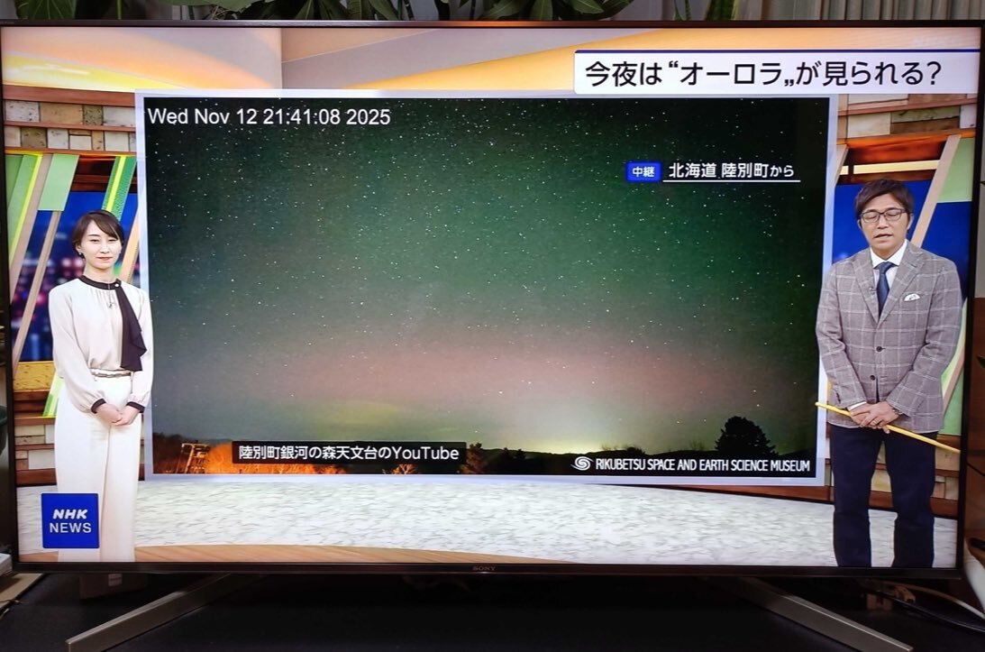 ニュースウオッチ9 で、北海道陸別町から見たオーロラをLIVEで紹介 このあと範囲が広がる、というオーロラ予想を放送でしたのは初 オーロラが広く見られるのは、大きな磁気嵐が発生しているためで、GPSや短波通信、人工衛星🛰️に影響のおそれがあり⚠️ #宇宙天気 #太陽フレア #CME #磁気嵐 #オーロラ