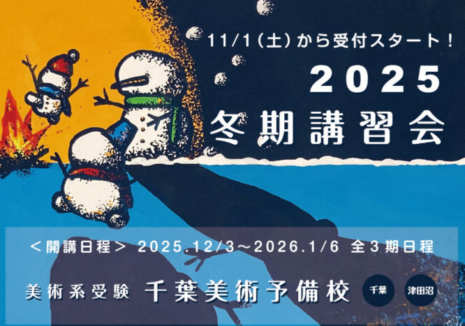 ❄️2025冬期講習会❄️ 冬期講習会の受付が11月1日(土)からスタート!受験生は、試験がいよいよ近づき、より一層緊張感が高まってくる時期です!課題の1つ1つを丁寧にこなして、着実に力を伸ばしていきましょう✊ chibabi.com/winter.html #千葉美 #美大受験 #実技対策 #冬期講習会 pic.x.com/w7DR9BGJIx