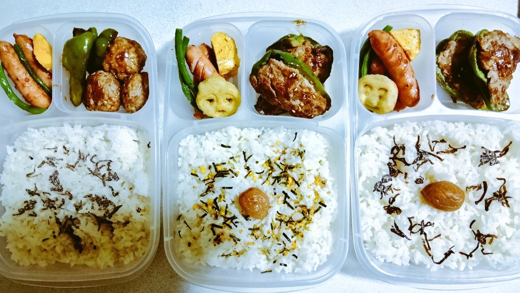 今週のお弁当 安い愛媛産の栗を買ったらほとんどが傷んでて 仕方なく芋ご飯 夕飯のハンバーグを作った時に一緒に作った デミグラスソースのミニハンバーグ これに惣菜のかぼちゃの旨煮を添えます #お弁当記録 #お弁当作り楽しもう部 #冷凍弁当 pic.x.com/sN9QvbEQjj