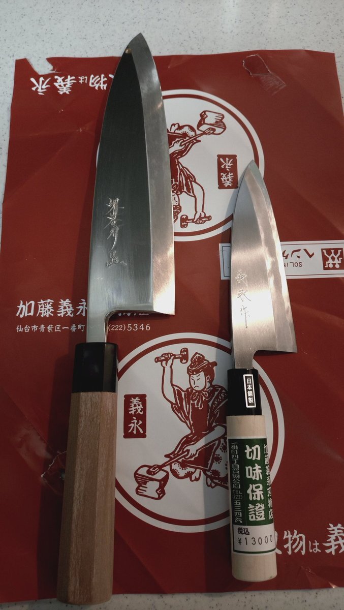 先日伺ったら店が閉まっていたので 本日街に出たついでに立ち寄った 加藤義永刃物店 まずは目的の出刃包丁 刃渡り15㌢ 以前料理人から頂いた24㌢のものと比べると大きさがよくわかる 次は刺身包丁を手に入れたい #加藤義永 #出刃包丁 pic.x.com/WyjfBGwsSQ