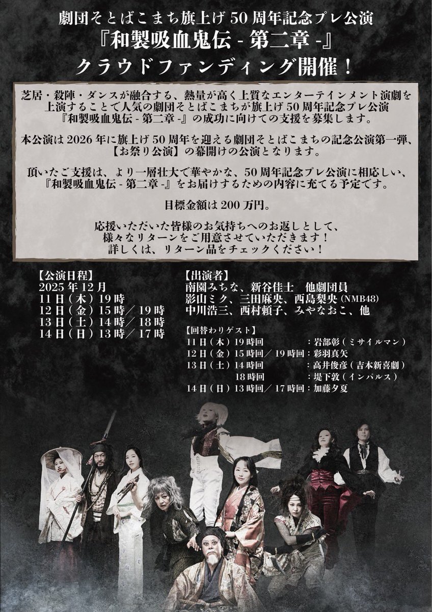 #和製吸血鬼伝 -第二章- 【クラウドファンディング】 #東學 氏デザインの #劇団そとばこまち50周年記念Tシャツ こちらの #黒地レッドラメ文字 の配色は #支援者 #出演者 #公演スタッフ 限定✨ ※こちらリターンの申込締切は11月30日になります ▼詳細 motion-gallery.net/projects/vampi… pic.x.com/JKTNnQaZTH