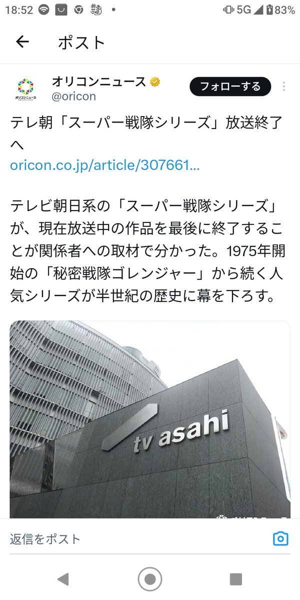 只今、スーパー戦隊シリーズ放送終了の報道に、そのシリーズに出演した事のある出演者の思い入れのツイートがキリがなく、止めどもなくTLに流れてくる。その勢いは言葉にならない。それもそうか…50年で携わった出演者は何百人に昇るだろうから。 #スーパー戦隊シリーズ #放送終了 #出演者 #思い入れ pic.x.com/ZN3TQsA61G