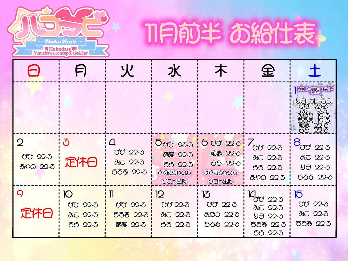 本日11/1のハコラビ🐇 ・ぴぴ @150cm_ore ・みゆう @miyuu_hkrv ・ちろる @chiroru_hkrv ・リヲ(予約出勤)@rio_hkrv リヲ24:00~おきゅいんです! 本日22:00~LAST🐰ᩚ #函館 #ハコラビ #コンカフェ #函館コンカフェ pic.x.com/r3vrfK23fz