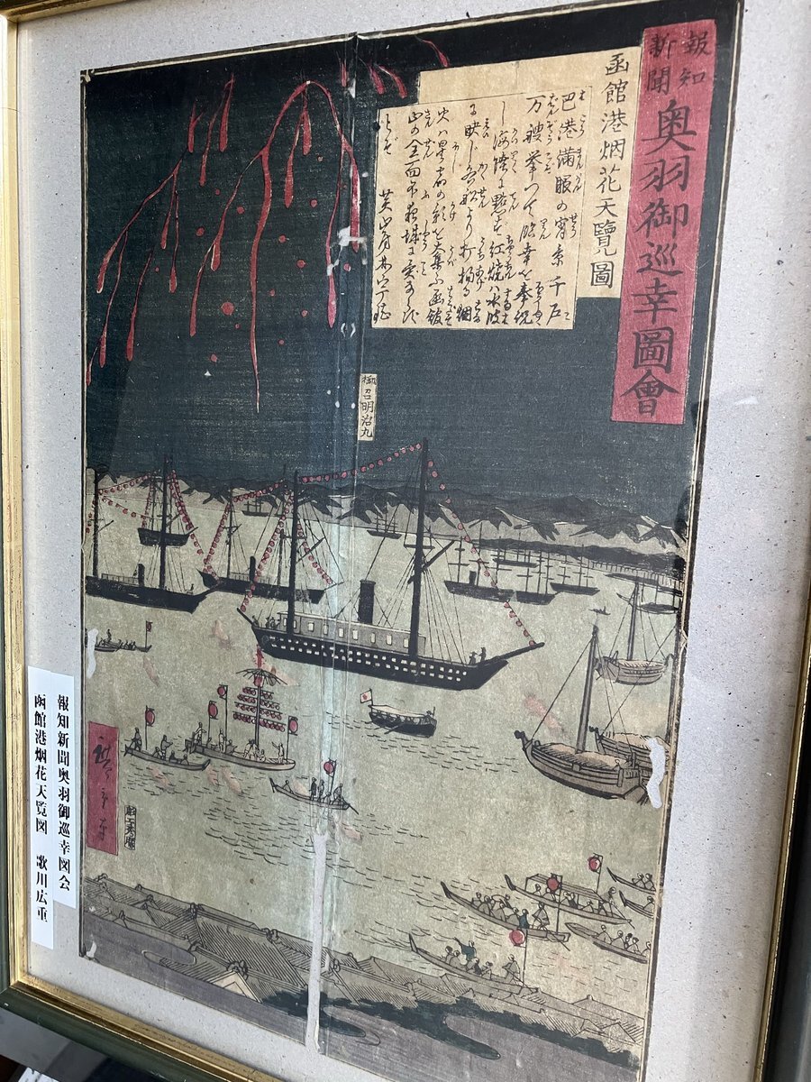 #歌川広重 ( #三代広重 )の #報知新聞奥羽御巡幸図会  #函館港烟花天覧図 です。 明治9年の作品です。 明治天皇が、明治丸に乗船され 現在の #海上自衛隊 函館基地  のあたりに上陸されました。 #函館 #函館の歴史 #函館美術 #北海道 #錦絵 #浮世絵 pic.x.com/xHncgRHBm4