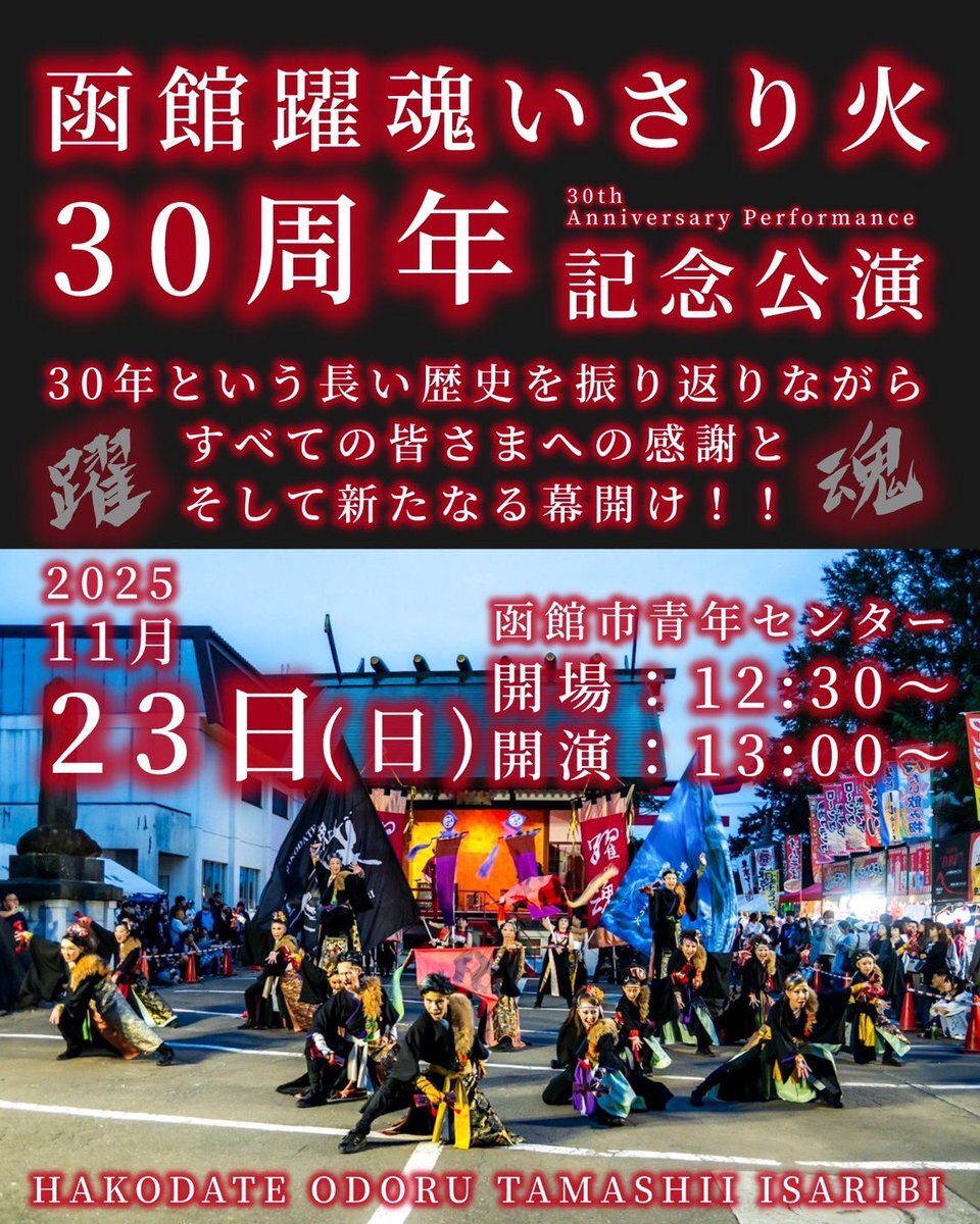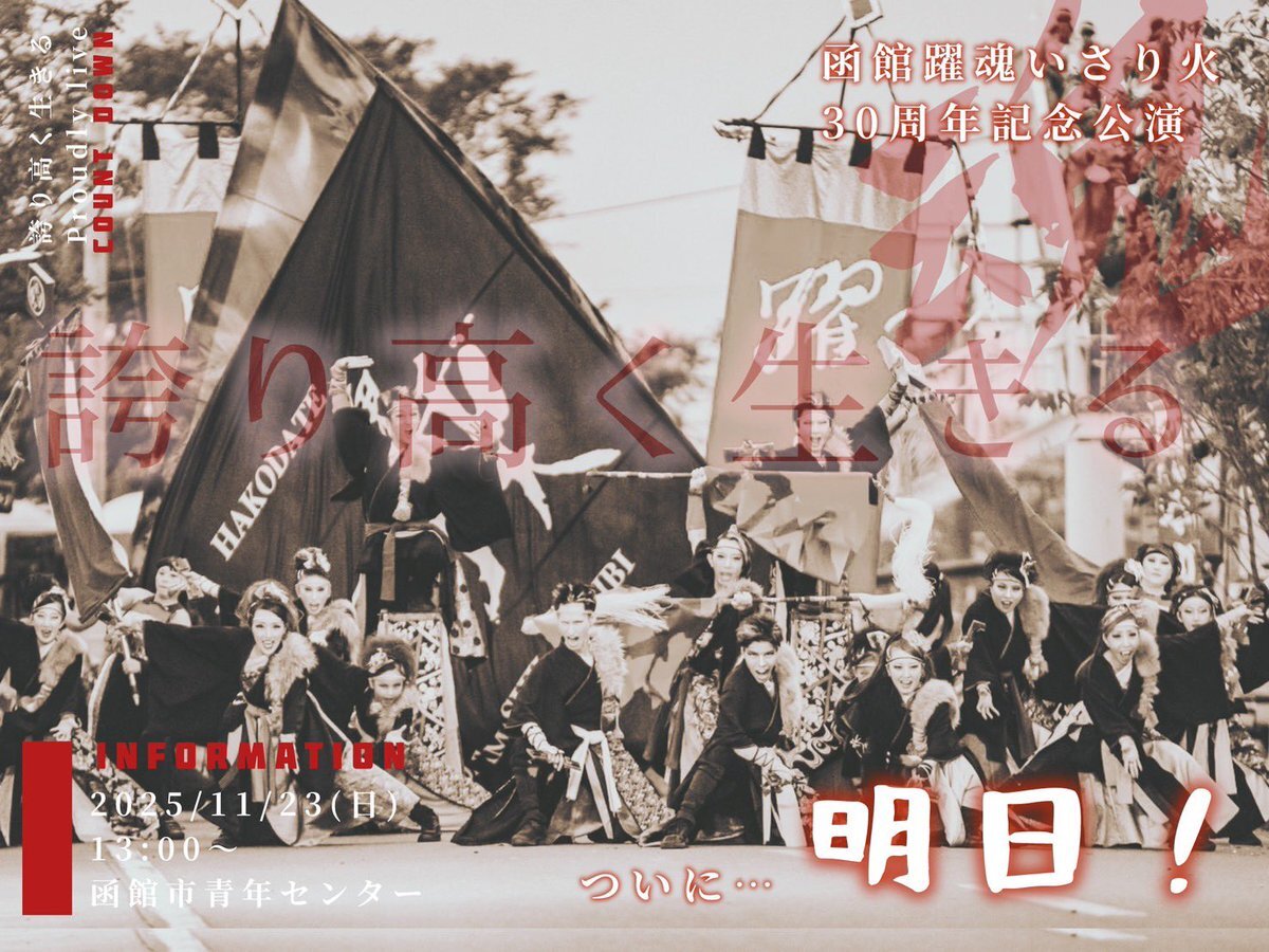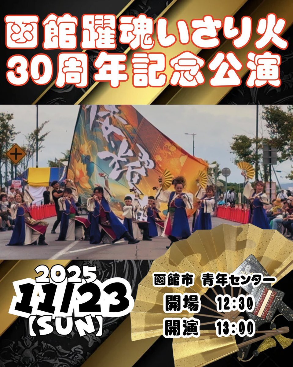 皆さま、是非いさり火の30周年記念公演のひとときをご一緒に!! #函館躍魂いさり火30周年記念公演 拡散していただければ幸いです! 日時:2025年11月23日(日) 開場12:30 開演13:00(2時間程度を予定しています) 場所:函館市青年センター #函館躍魂いさり火 #よさこい pic.x.com/DOzGxkOiIJ