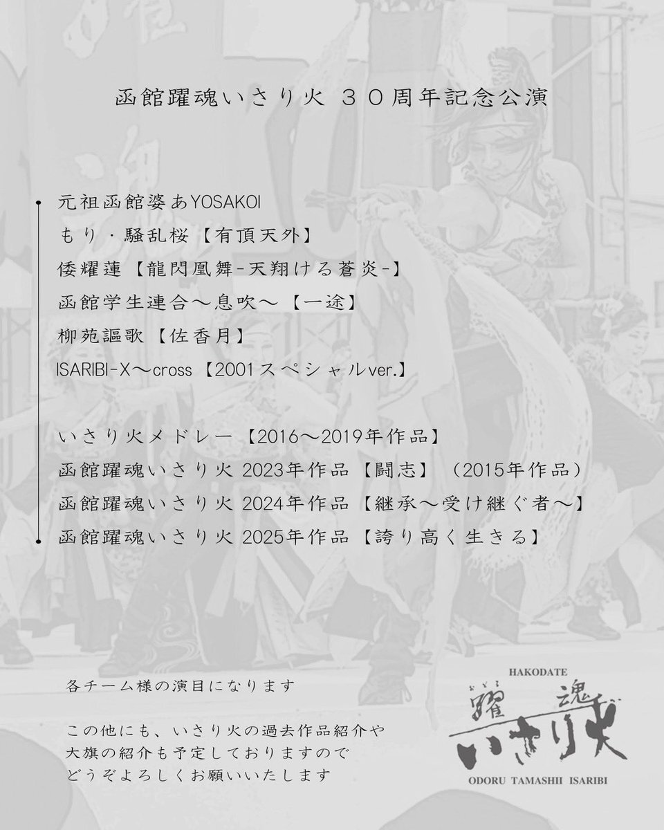 函館躍魂いさり火30周年記念公演 改めまして、会場にお越しの皆さま、演舞で盛り上げてくださった各チームの方々、本当にありがとうございました 当日の振り返りをどうぞご覧ください❶ #函館躍魂いさり火 #函館躍魂いさり火30周年記念公演 pic.x.com/eOkvXXw5ni