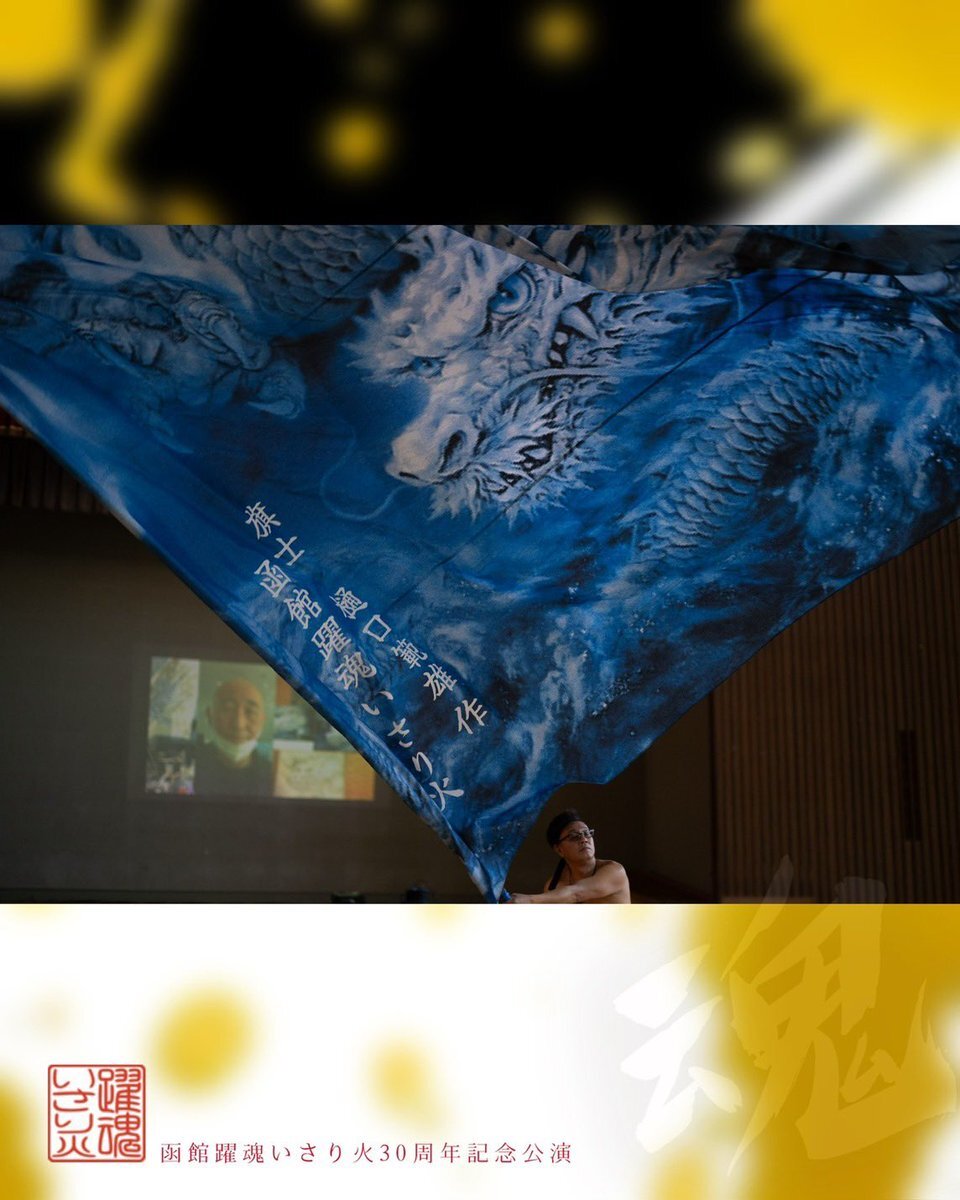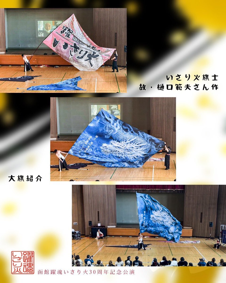 ⑧いさり火大旗紹介 いさり火の旗士、故・樋口範夫さん作 時にいさり火のサポートをしていただき、樋口さんとも親交のある、旗士道、 Crew鍵“ルーキー”のケンジさんに振っていただきました! #函館躍魂いさり火 #函館躍魂いさり火30周年記念公演 pic.x.com/lSjALJ8vpU