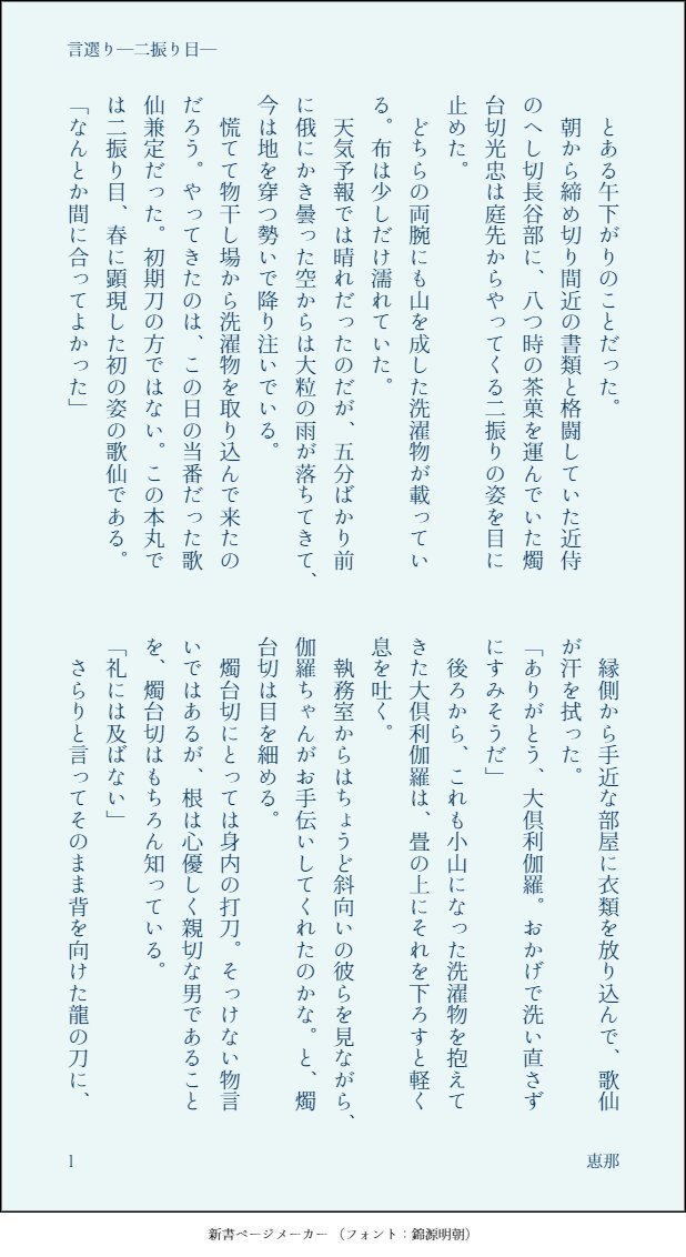 『言選り―二振り目―』 二振り目の歌仙さんが唐突に「大倶利伽羅はえっちだよね!」と無邪気に言い出したことから始まるちょっとした騒動。 (先日呟いたネタをまとめ直してみたものです) 登場:歌仙兼定、大倶利伽羅、燭台切光忠、へし切長谷部、加州清光
