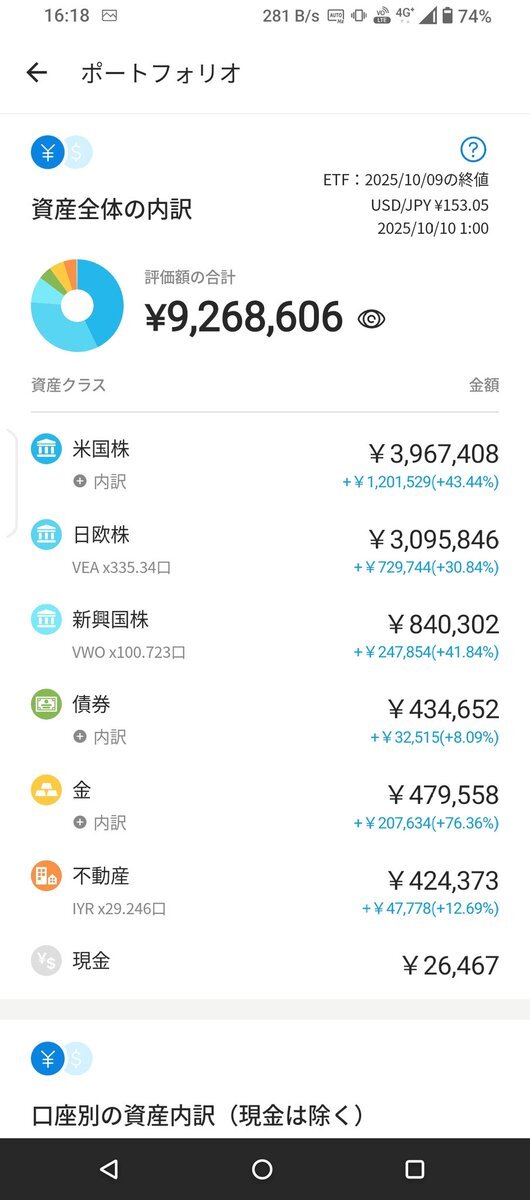 今日のポートフォリオ内訳です📈 ​評価額:¥9,268,606 ​評価額が念願の900万円台に到達! 先週の¥8,892,696から約37万円の大幅増です。ドル円が153円台と、先週の147.35円から大きく円安に振れたことも、評価額を大きく押し上げています。 #ウェルスナビ #資産運用 #分散投資 #ポートフォリオ pic.x.com/DqQXka4wrP