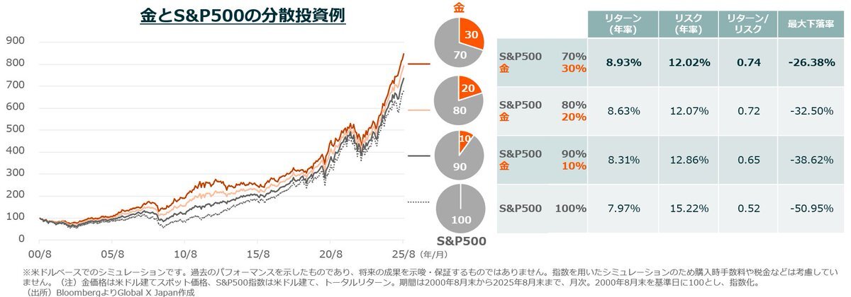 S&P500単独より金を約30%組み入れることで、 ・長期的な下落耐性(最大ドローダウン半減) ・リターン/リスク比の改善 が実現。 金は“守り”ではなく、攻めの分散資産です。 #ゴールド投資 #資産運用 #分散投資 #SP500 #ポートフォリオ戦略 x.com/globalxetfsjpn…