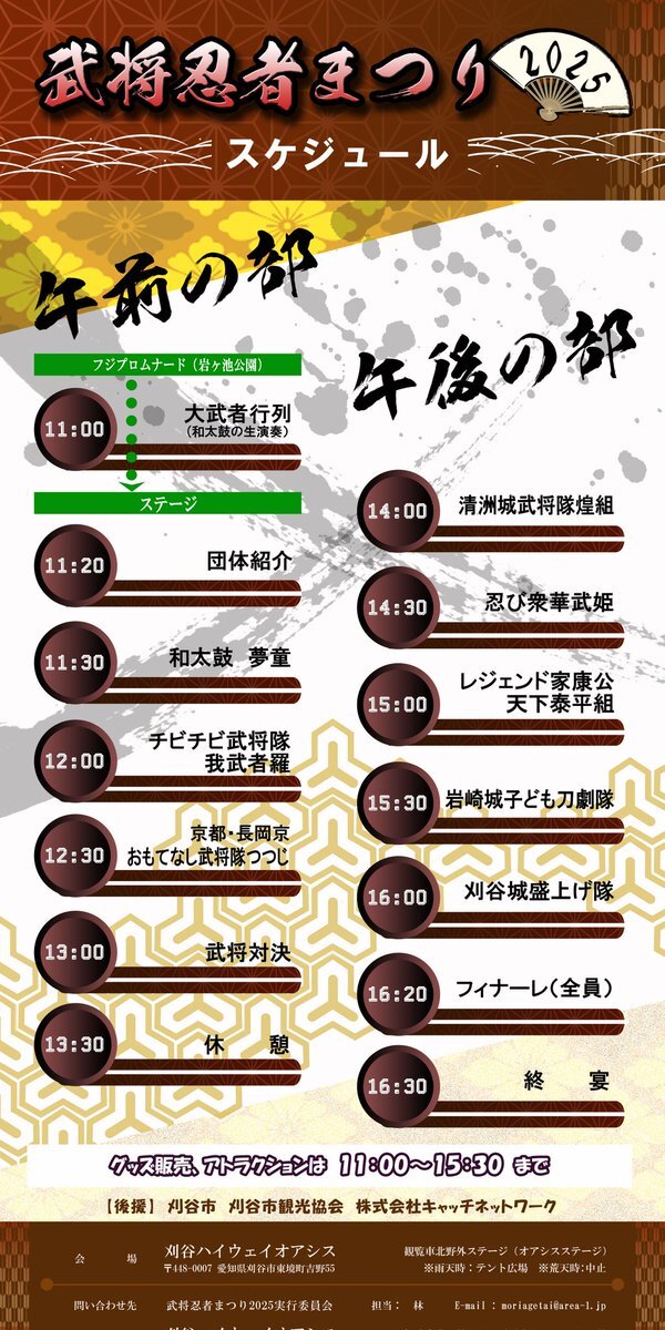 いよいよ #武将忍者まつり2025 まで丁度1ヶ月となった! たいむすけじゅーるも決まったぞ! 儂らもちとばたばたしておるが、最高に楽しき1日なること間違いなし! 後は、天気と当日の己のこんでぃしょんの調整じゃ! 皆で共に楽しき思い出を作ろうぞ! #刈谷ハイウェイオアシス #刈谷城盛上げ隊 pic.x.com/fmXv1FYClt x.com/onihyuga1564/s…