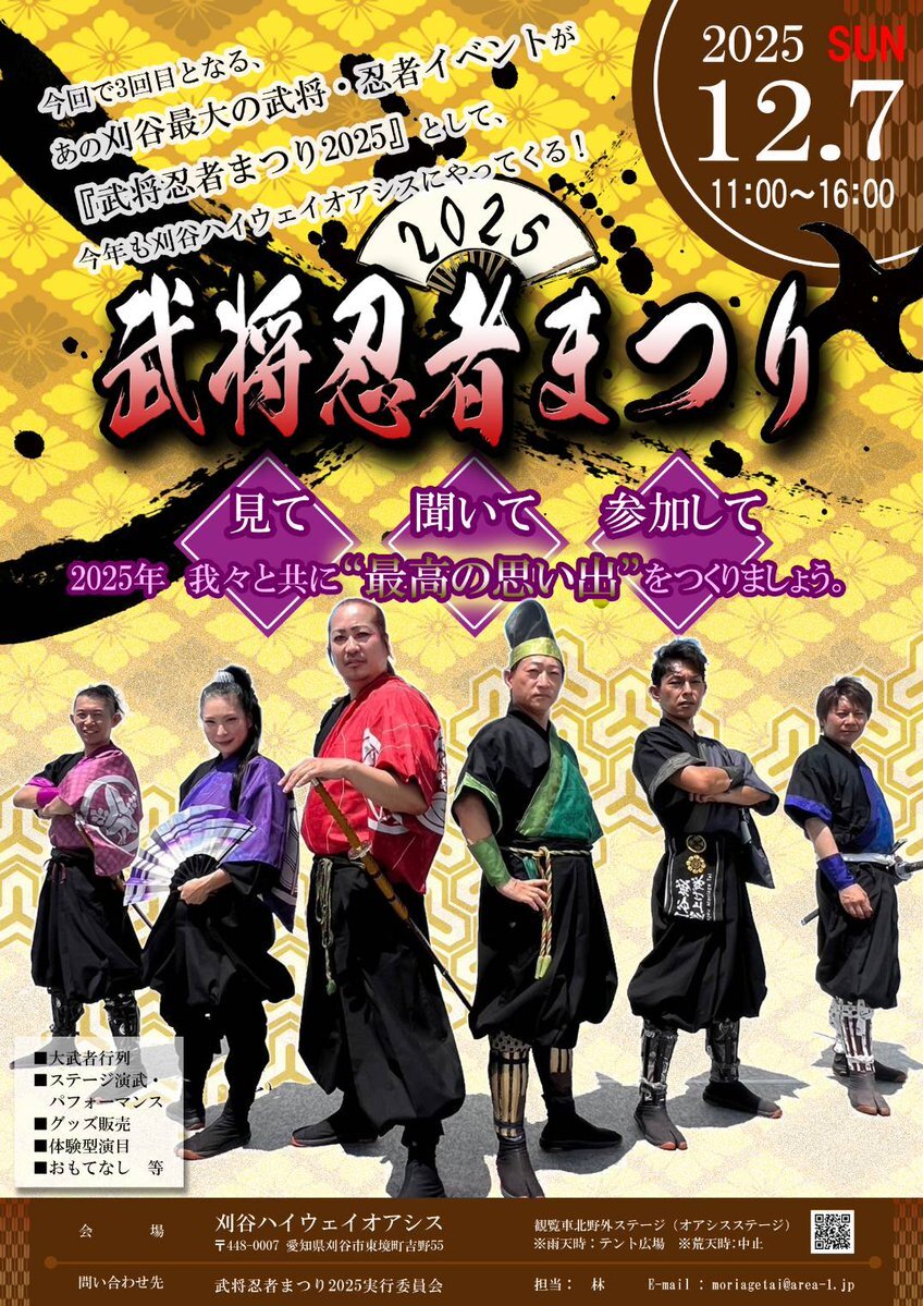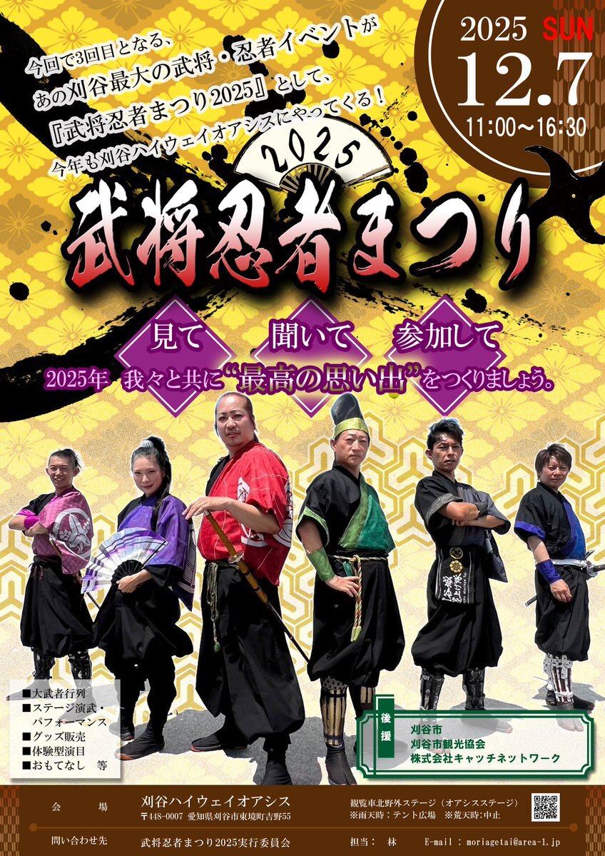 今年も開催決定っ!! 12月7日(日) #刈谷ハイウェイオアシス にて #武将忍者まつり2025 開催します! 我々 #刈谷城盛上げ隊 の他、8団体の参加が決定! 今年も見て!聞いて!参加して!2024年の楽しき思い出を共に作って参ろうぞ! ※屋外故、防寒対策をしかと忘れずに!