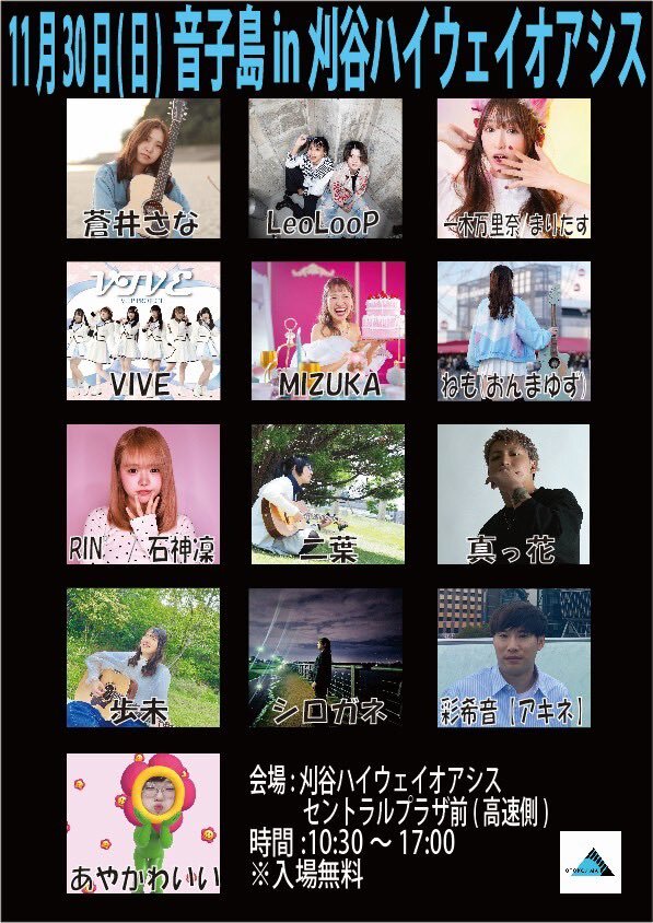 🦁LIVE INFO🦁 🌟音子島in刈谷ハイウェイオアシス🌟 🗓11/30(日) 📍刈谷ハイウェイオアシス セントラルプラザ前高速側(愛知) ⏰15:30~15:55(出演予定時間) 刈谷ハイウェイオアシスにて行われる こちらのイベントに出演が決定✨ 久しぶりの刈谷でのイベント ぜひ一緒に楽しみましょう!