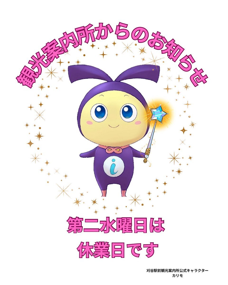 ⁡ こんにちは! 刈谷駅前観光案内所です。 ⁡  【お知らせ】 ⁡ 明日、11月12日(水)は 刈谷駅前観光案内所の休業日となります。 ⁡ マンホールカード配布もお休みです。 ⁡ 📢毎月第二水曜日は休業日です #刈谷駅前観光案内所 pic.x.com/2A5zgjcF0t