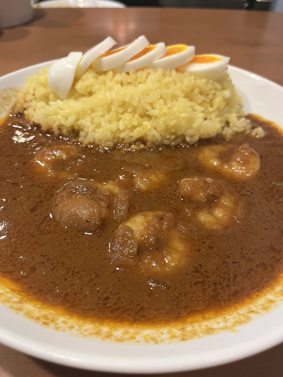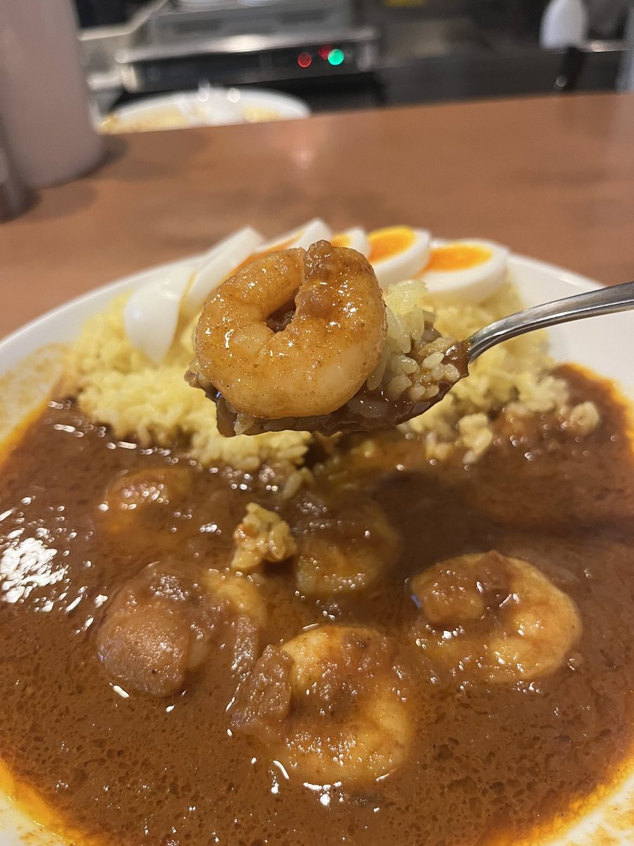 きんもち えびカレー ゆでたまご 久訪です。この日も相変わらず混んでるなぁ… 初のエビカレー、その食感とエビの旨みがコクマシマシカレーにめちゃくちゃ合っており、ターメリックライスと絡ませて食べる手が止まりませんよ いやぁ、今回も美味しかったです ご馳走様でした #きんもち #カレー #初台 pic.x.com/je3ObmEKaI