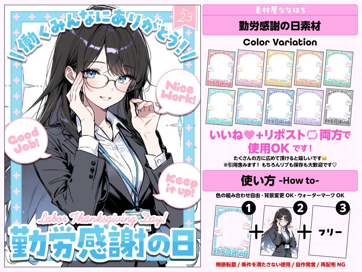 11月23日(日)は #勤労感謝の日 👓✨ 褒め言葉いっぱいの ポップでかわいい素材です😆✨ ⚠️いいね🩷とリポスト🔄で使用OK❣️ カラバリ10色✧︎*。 ツリーにつなげます🐝⋆゜ #素材屋ななはち #おはようVTuber素材
