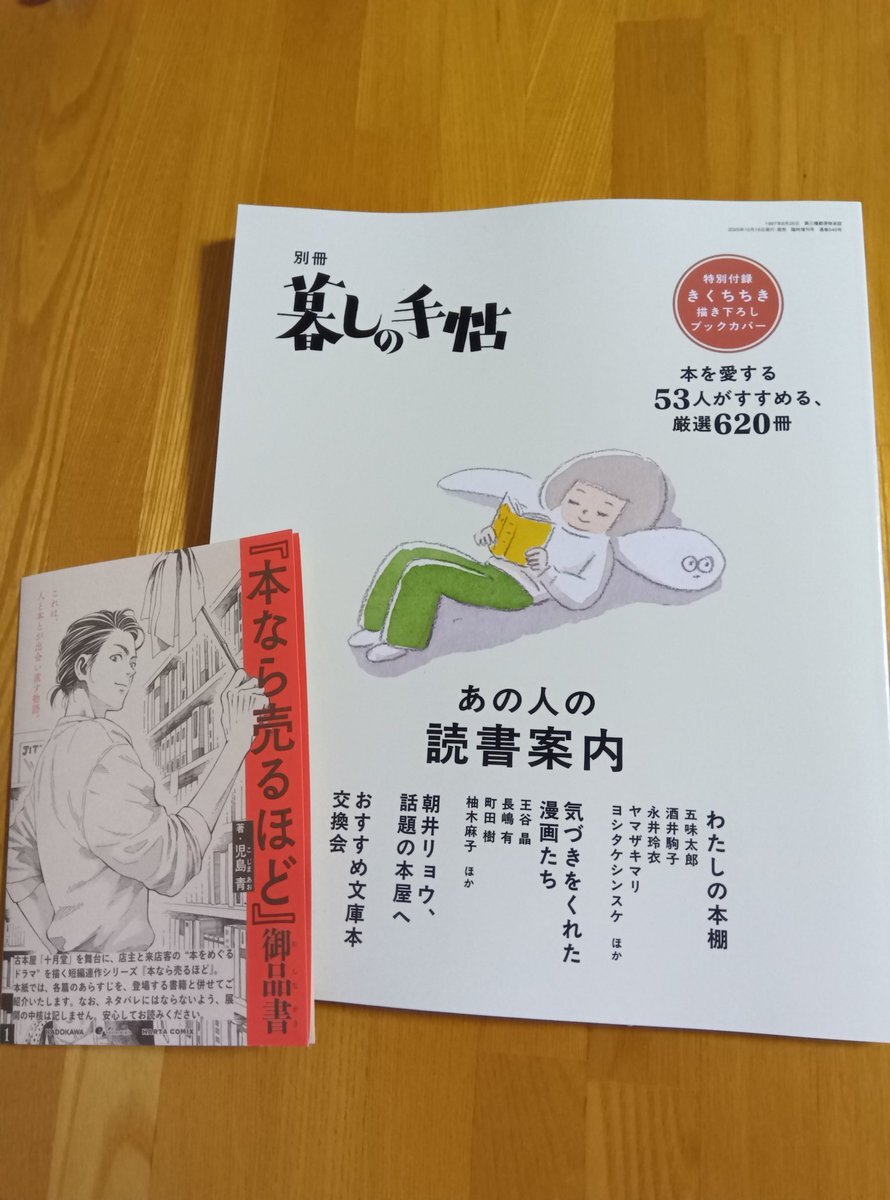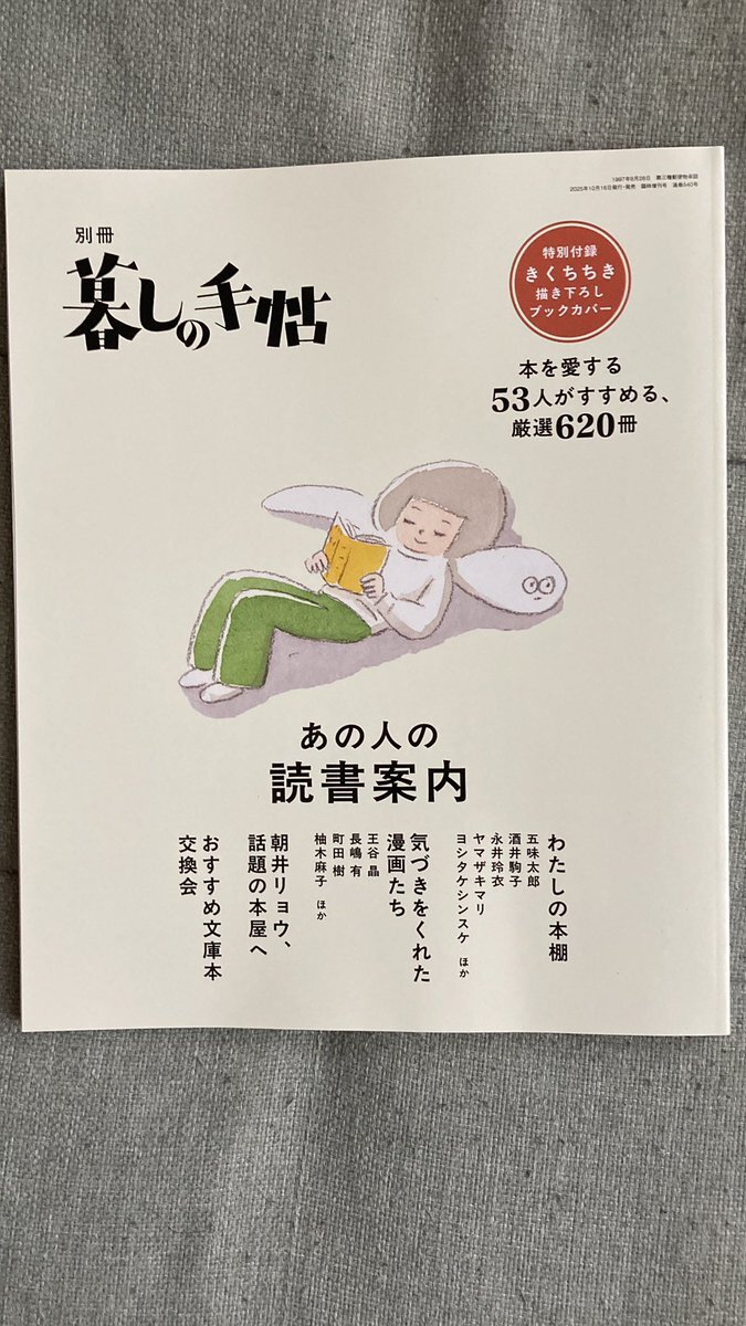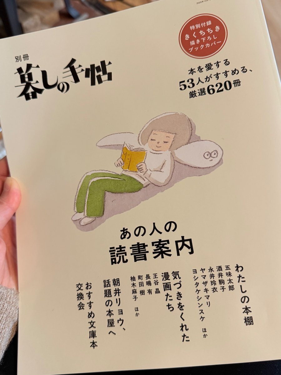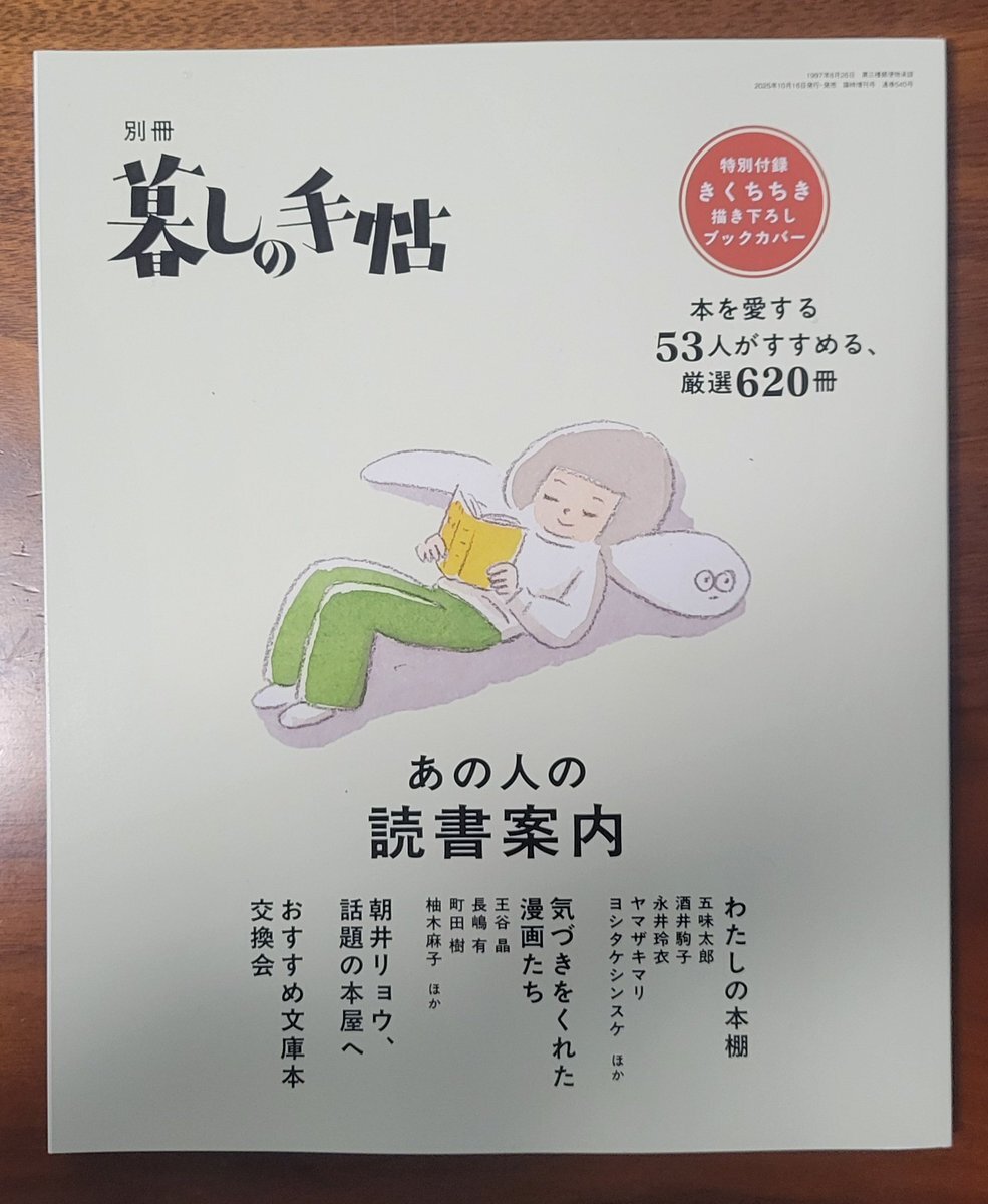 本日の注目本 #別冊暮しの手帖 『あの人の読書案内』 本を愛する53人がすすめる、厳選620冊 五味太郎、酒井順子、永井玲衣、ヤマザキマリ、ヨシタケシンスケ、長嶋有、柚月麻子、王谷晶、朝井リョウほか pic.x.com/NKAwLbGpJq