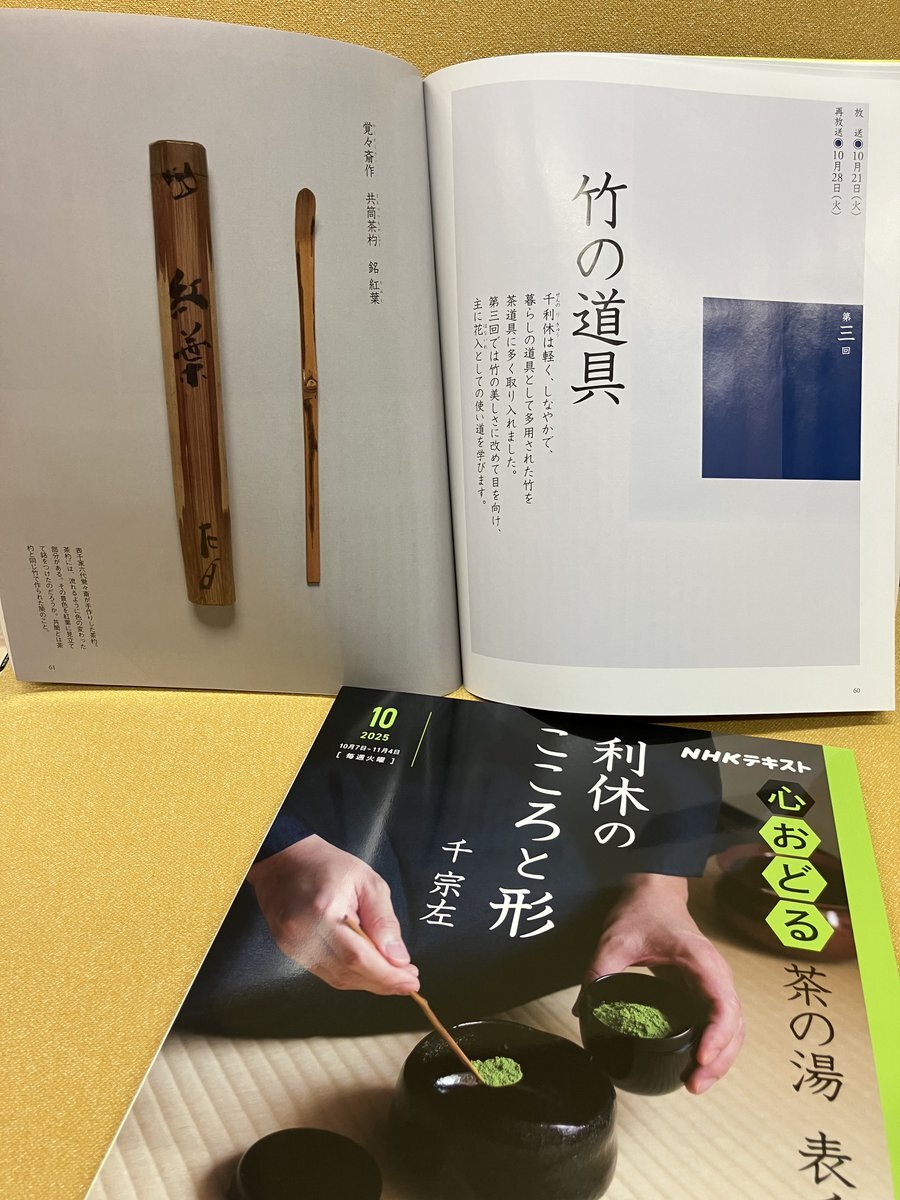 #心おどる茶の湯表千家 #利休のこころと形 ご覧いただいていますか?今日は第3回「竹の道具」です。茶道具に多く取り入れられてきた竹。今回は主に花入としての使い道を学びます。#Eテレ午後9時30分 から📺テキスト片手にご覧ください📗 pic.x.com/ib8gkqS6e2