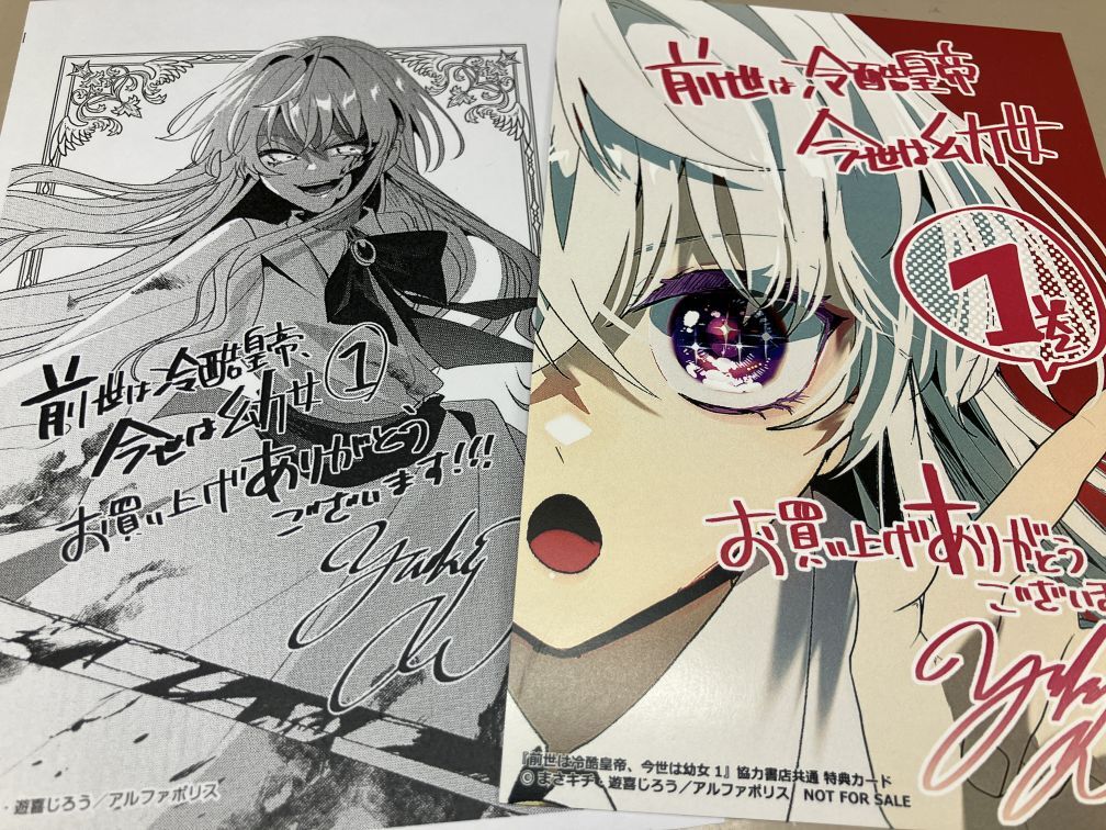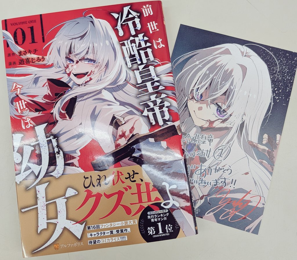 【サイン本】本日、遊喜じろう先生の最新刊「前世は冷酷皇帝、今世は幼女 第1巻」の直筆サイン本を戴きました!店頭にて先着での販売となります。数に限りが御座いますのでお早めに!※お取り置き・代引き等通販は承っておりません※(あ) #前世は冷酷皇帝今世は幼女 #遊喜じろう pic.x.com/IWYxavjl5z