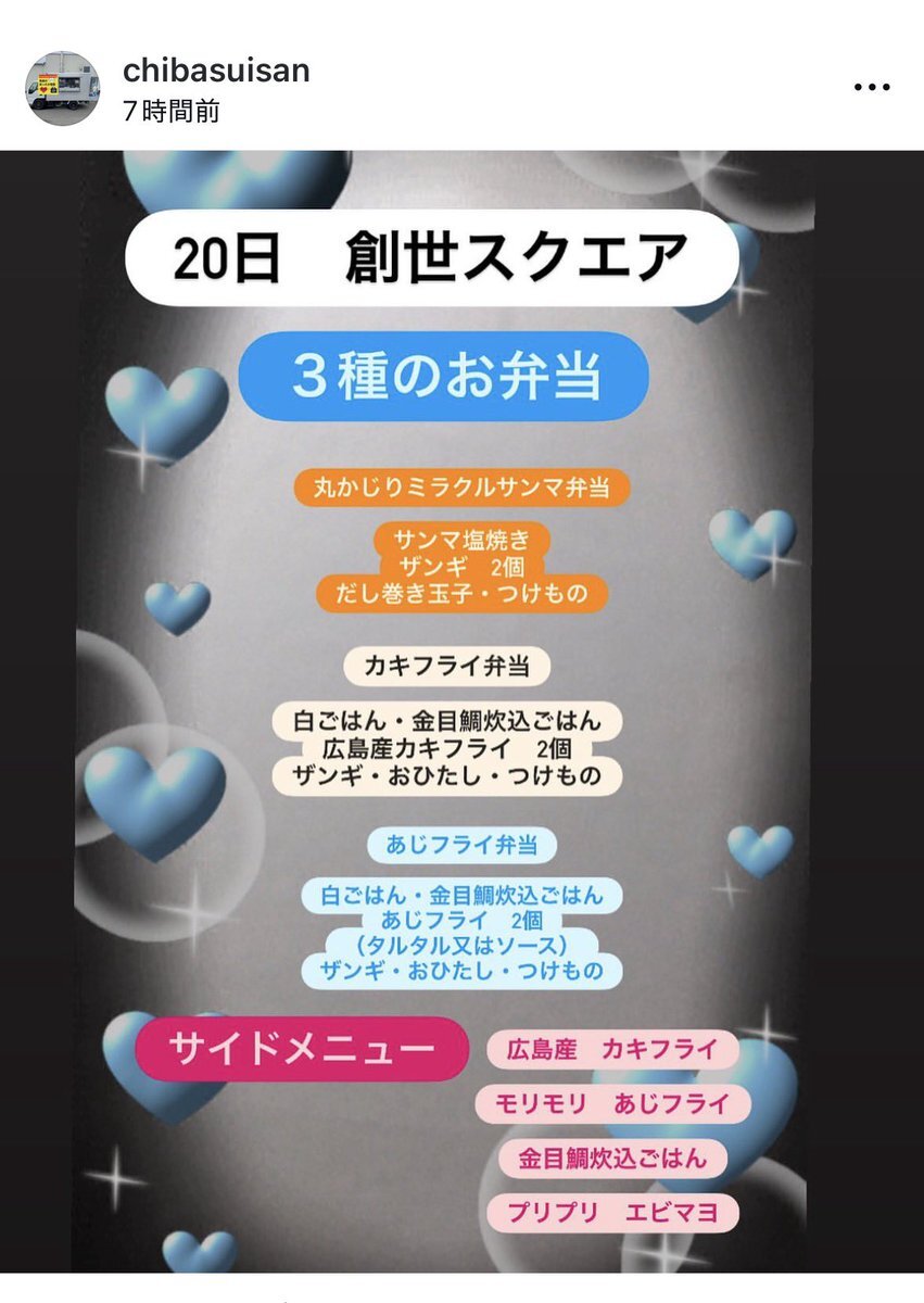 明後日🤗11月20日 (木) 『さっぽろ創世スクエア』さんにランチ🍱出店🚚 札幌市中央区北1条西1丁目6 🕰️ 午前11時〜午後2時30分 メニューはお弁当🍱3種類(丸かじりミラクルサンマ弁当・カキフライ弁当・アジフライ弁当)と単品お惣菜です👩🏻🍳 #創世スクエア #魚屋さんのキッチンカー #千葉水産 pic.x.com/vhRp8JL9pj