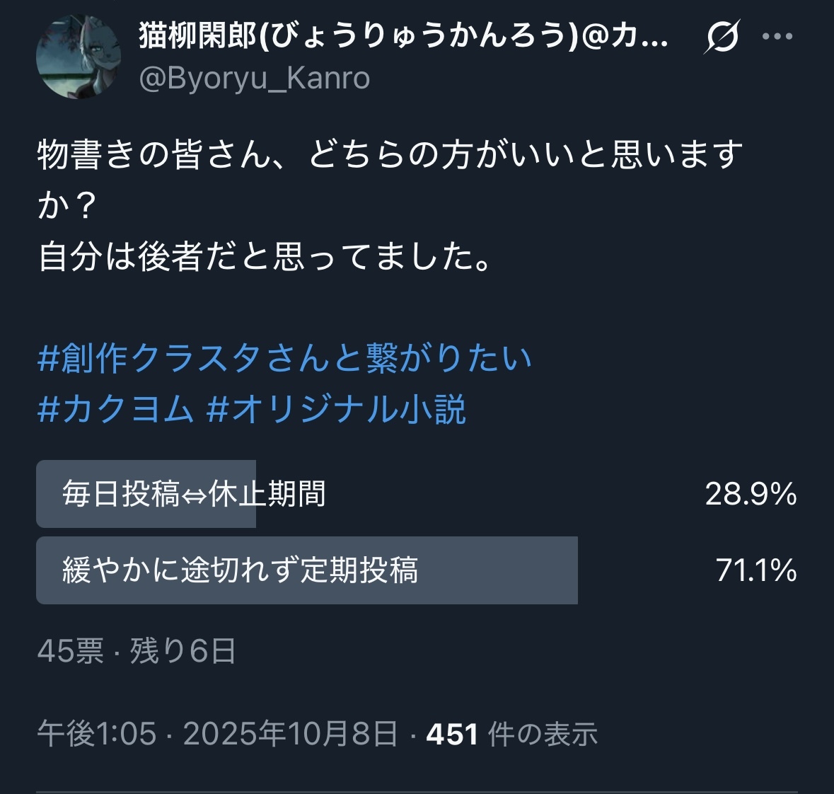 自分の作品のイメージに合う絵柄の絵師様を探し、予算と相談し、群像劇故どのキャラを入れるか考え、ある程度キャラのビジュを練り……。 表紙?イメージ絵?依頼まで行きつかず疲労が……💦 #創作クラスタさんと繋がりたい #カクヨム #オリジナル小説 x.com/Byoryu_Kanro/s…