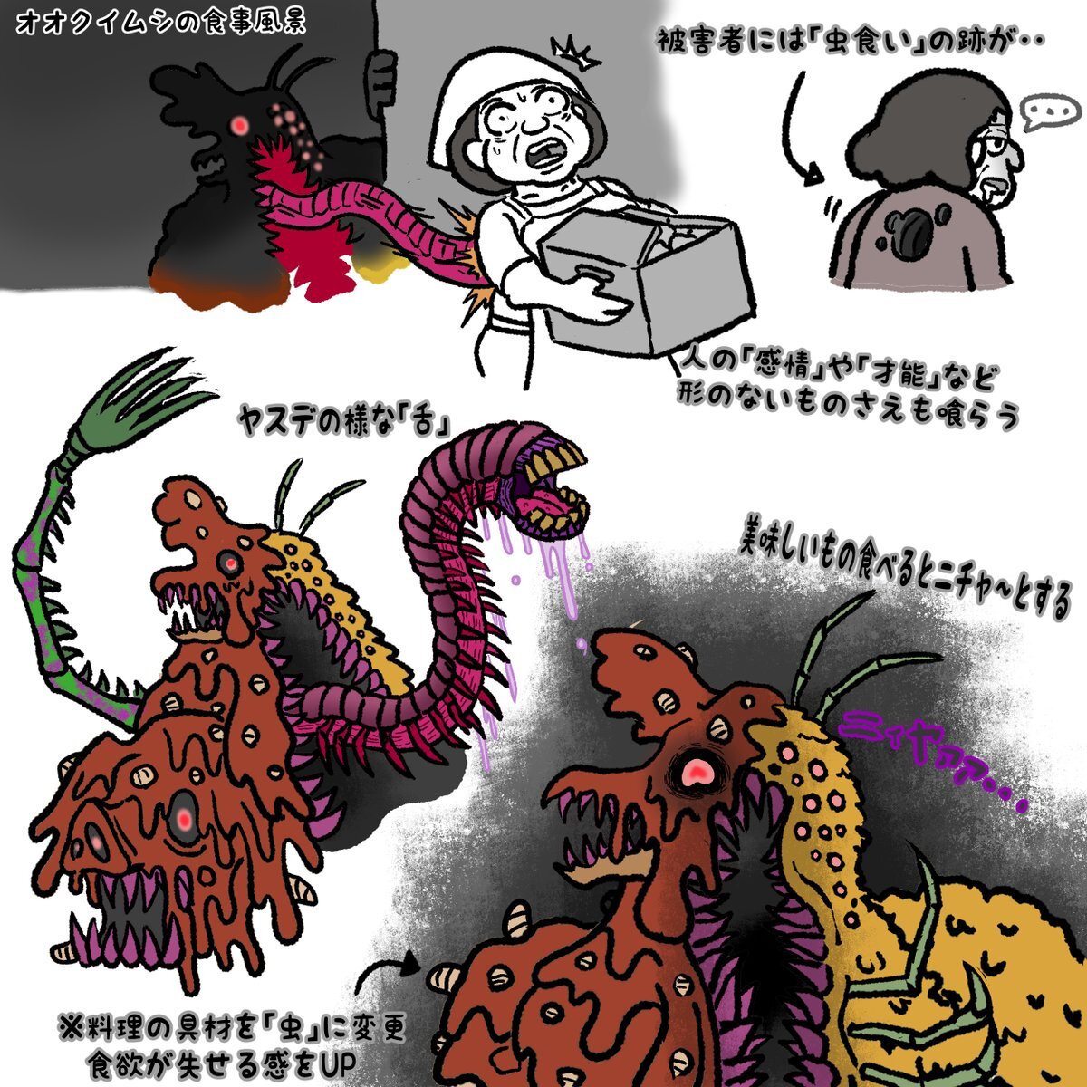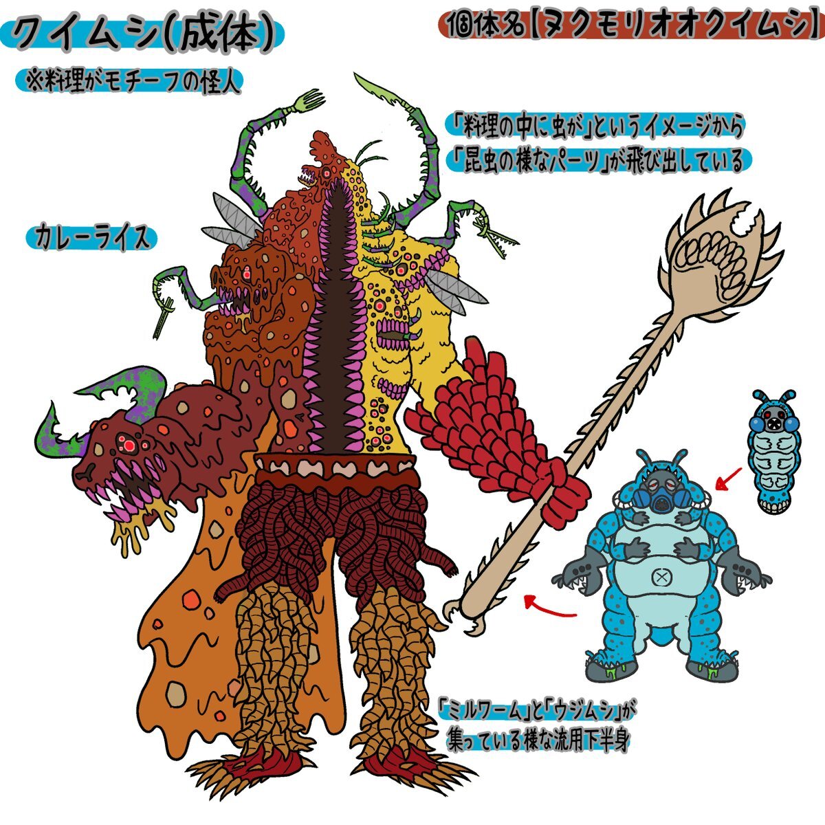#創作 #オリジナル怪人 #創作クラスタさんと繋がりたい 「暴食」がテーマの怪人【クイムシ】 の食事についての設定 「虫が集る 汚く盛り付けられた料理」をデザインのモチーフにしてます あらゆるモノを貪り食う異界からやってきた蝗害 自然物・無機物はおろか 形の無いものさえ食べてしまいます pic.x.com/7KSrUgeGl7