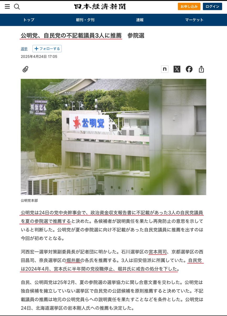 公明党(参院選) 「裏金議員を応援します‼️」 ↓ 公明党(連立離脱時) 「政治とカネガー」 創価学会を信じるとこんな馬鹿になれるんだなw #馬鹿製造機創価学会 なんか信じる者は馬鹿になる #創価学会はカルト宗教 公明党、自民党の不記載議員3人に推薦 参院選 - 日本経済新聞nikkei.com/article/DGXZQO…