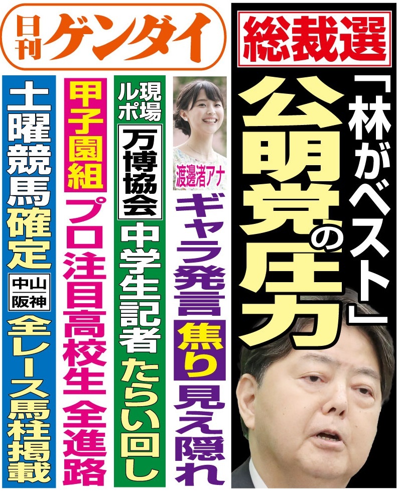 9/19(金)発行の #日刊ゲンダイ です。 5人が争う構図となった自民党総裁選だが、林官房長官が正式な出馬表明会見を開いた。世論調査では小泉や高市の後塵を拝し、林は現状3番手で追いかける展開とみられているが、隠れた“援軍”は連立政権を組む公明党!? 詳しくは本紙3面をご覧ください!