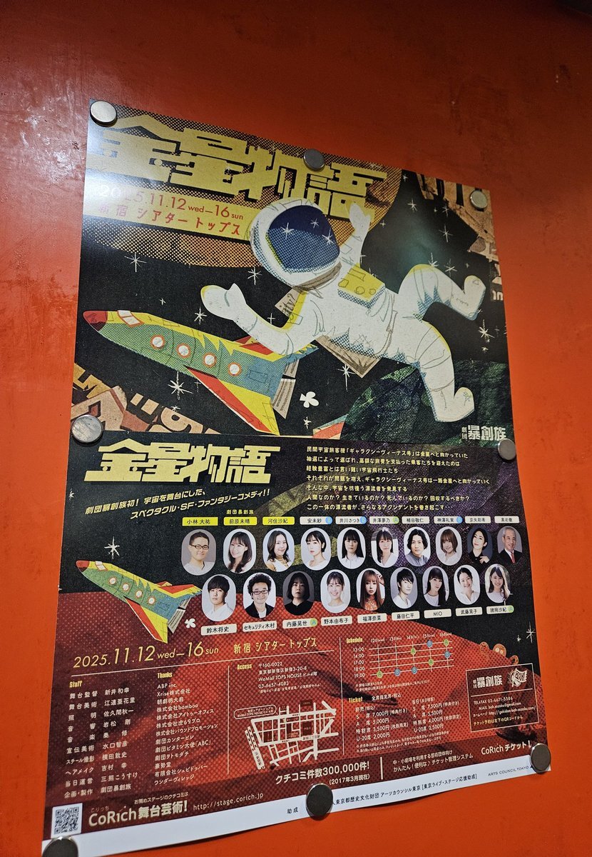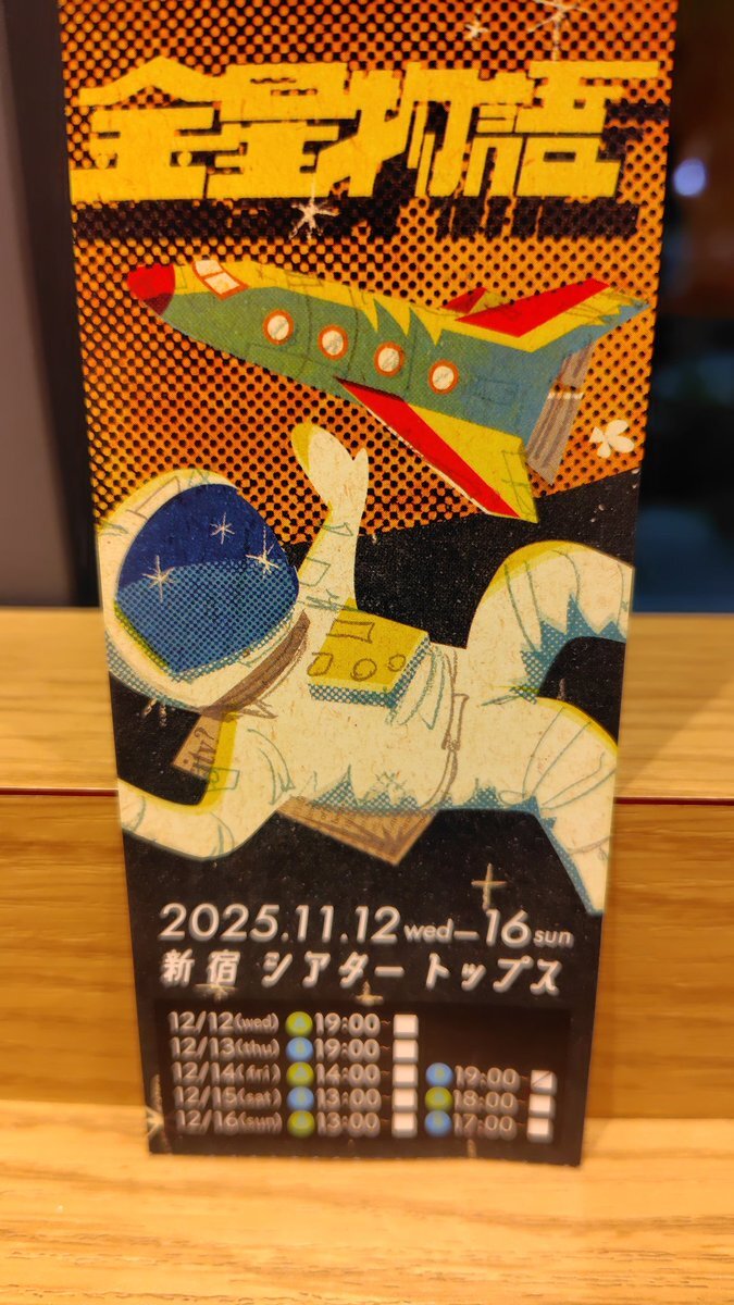 まず、「よくこんなのやろうと思ったな(勿論褒め言葉)」。#劇団暴創族 様、毎回に新しいチャレンジが仕込まれてますが今回もヤッちゃってます。この空間のバランスで破綻させない演出、役者、本当に常識が通じない。小ネタもラストも何を喋ってもネタバレになるので、皆観てください…… #金星物語 pic.x.com/lszAfrhbMO