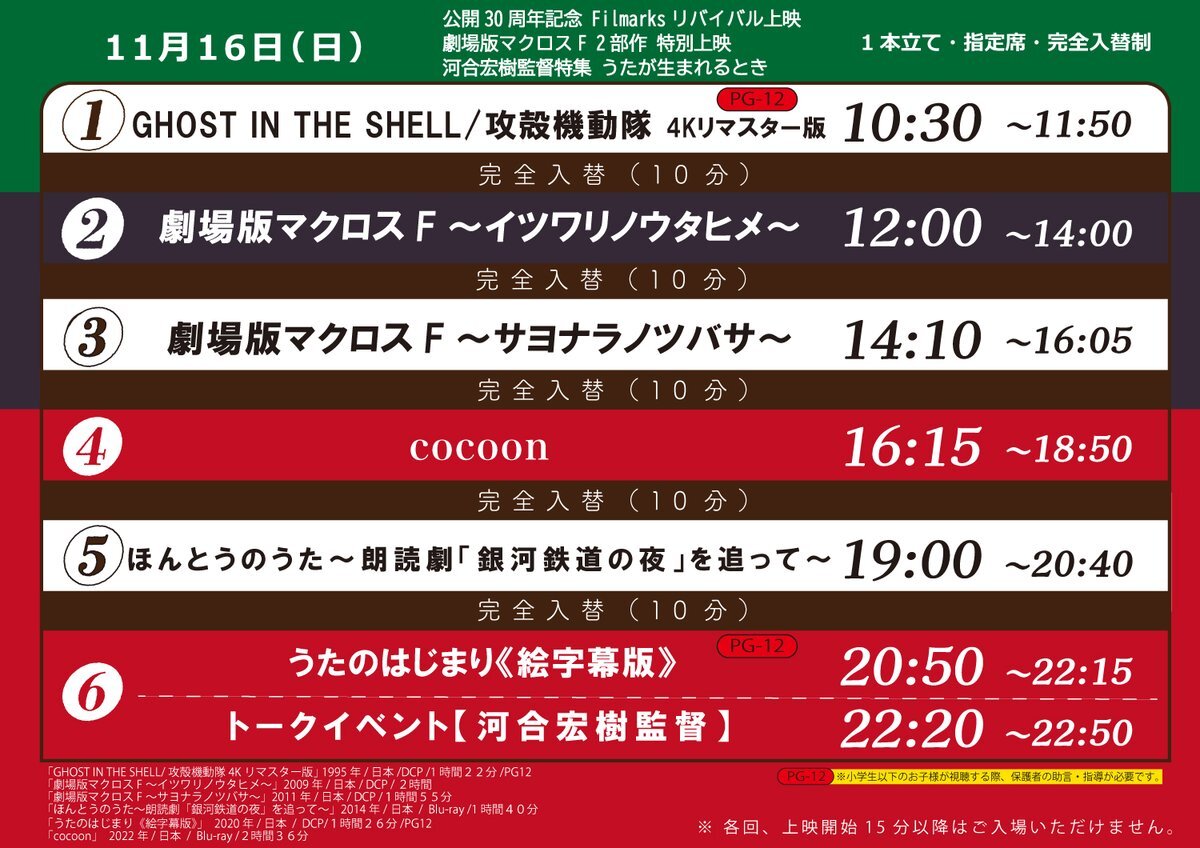 【🩷初日です💚】 📅11/16㊐ 『GHOST IN THE SHELL/#攻殻機動隊』 『#劇場版マクロスF~イツワリノウタヒメ~』 『#劇場版マクロスF~サヨナラノツバサ~』 『#ほんとうのうた ~朗読劇「銀河鉄道の夜」を追って~』 『#うたのはじまり』 『#cocoon』 🎟️ご予約⇒x.gd/Pvu7J pic.x.com/ocYWQvE2Yr