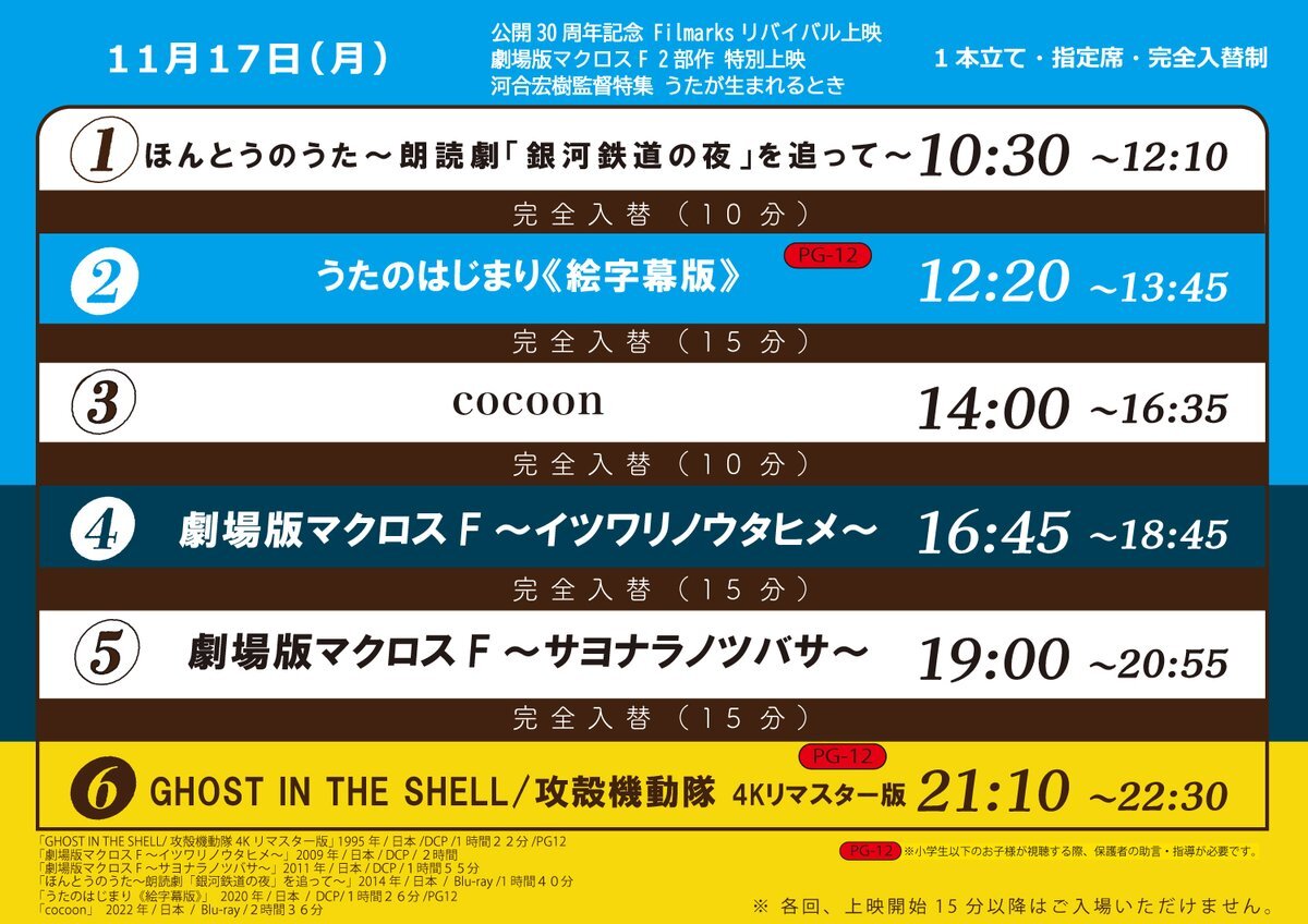 【🩷2日目です💚】 📅11/17㊊ 『GHOST IN THE SHELL/#攻殻機動隊』 『#劇場版マクロスF~イツワリノウタヒメ~』 『#劇場版マクロスF~サヨナラノツバサ~』 『#ほんとうのうた ~朗読劇「銀河鉄道の夜」を追って~』 『#うたのはじまり』 『#cocoon』 🎟️ご予約⇒x.gd/Pvu7J pic.x.com/Pe9CRnocM0